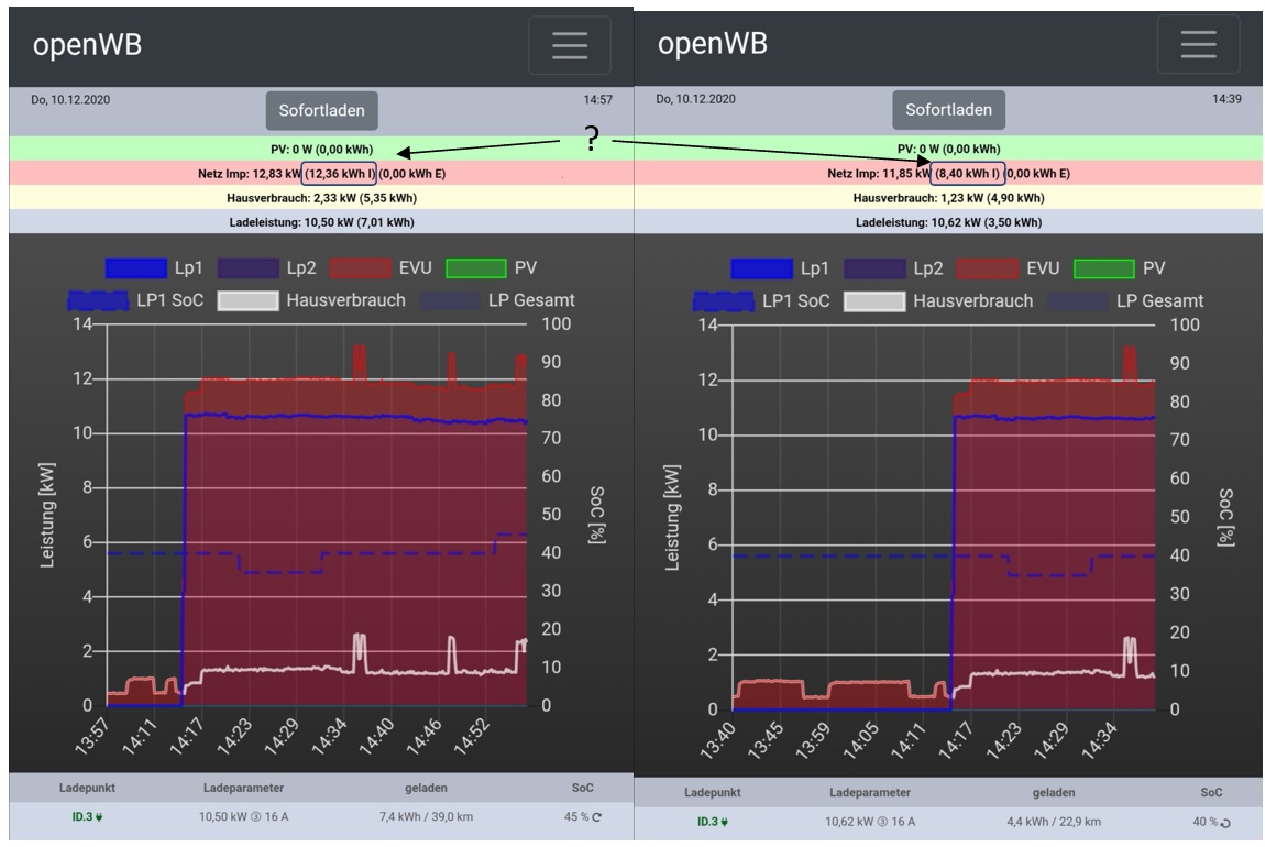 Szenario: Ich lade mein Auto mit 10,53 kW, der Hausverbrauch wird mit 1,24 kW angezeigt, Netz Imp: zeigt 11,77 kW