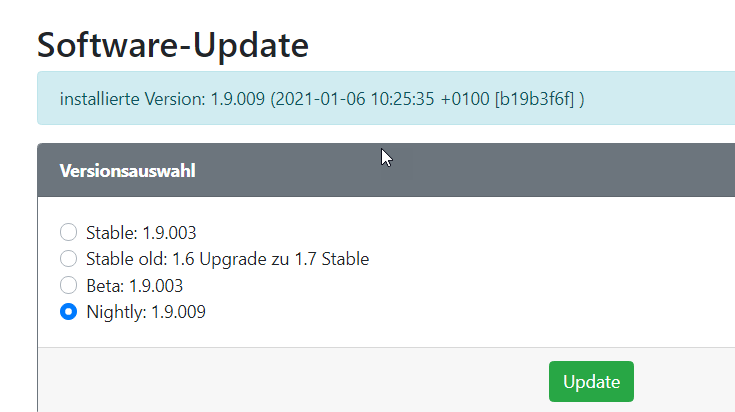 Nachdem ich gestern auf die 1.9.009 nightly upgedatet habe, hat mir heute der Support gesagt, er habe eines meiner Probleme heute gefixt und ich solle auf die neue nightly updaten. Aber woher sehe ich, ob ich tatsächlich auf eine neue Version update? Der Screen sieht so aus:
