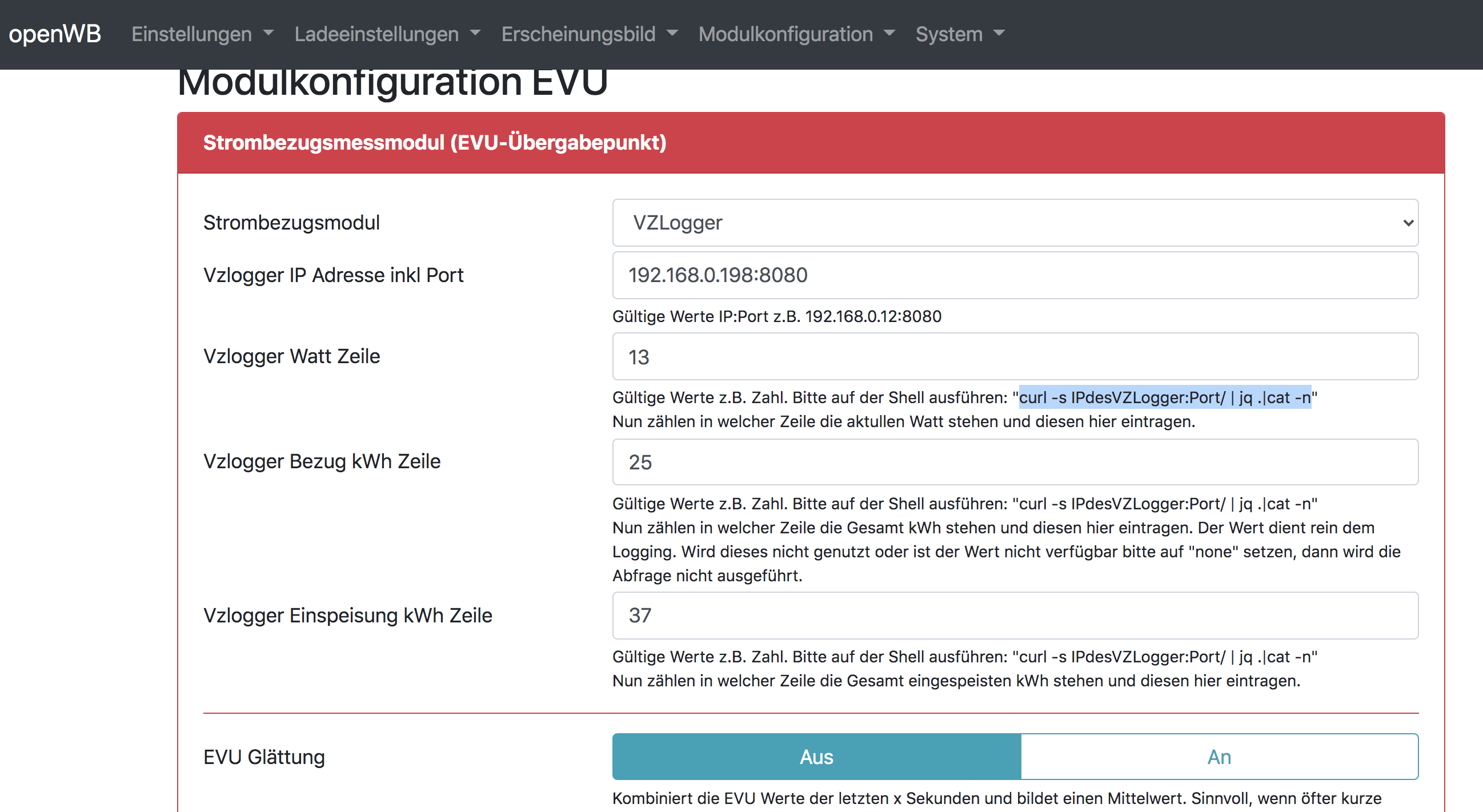 in der Modulkonfiguration EVU steht: curl -s IPdesVZLogger:Port/ | jq .|cat -n