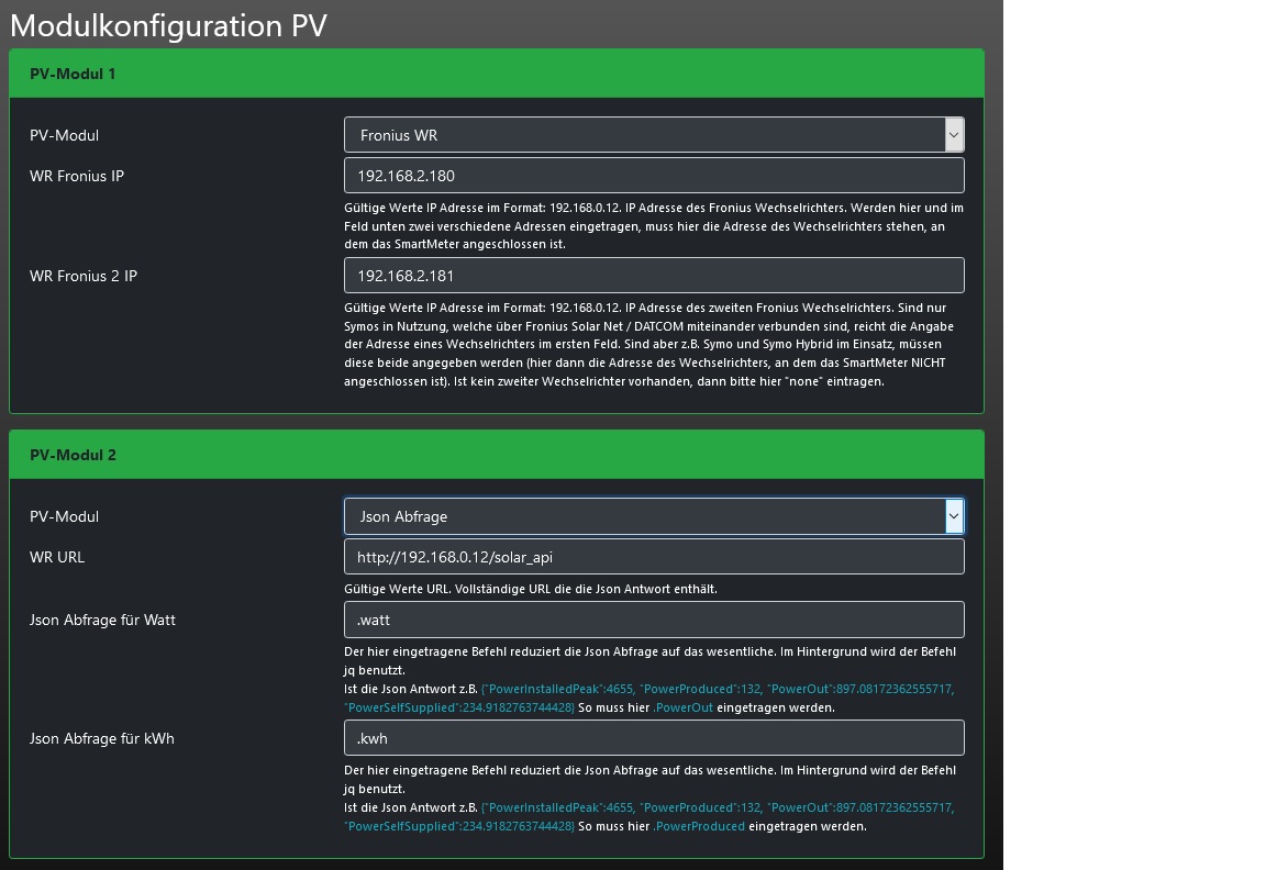 ich beabsichtige bei mir eine weitere PV-Anlage mit einem Fronius WR zu installieren. Da die Anlagen auf 3 verschiedenen Gebäuden montiert sind kann ich die Fronius Symo nur jeweils per IP einbinden. Das 2.PV modul beinhaltet leider keine Fronius Abfrage.