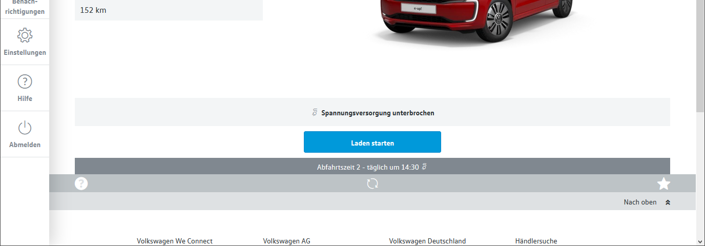 Wenn man in dieser Situation (Ladeanforderung der openWB mit 6A und e-up reagiert nicht) mit dem PC-Browser zum e-Up VW-Server verbindet, dann meldet er dort „Spannungsversorgung unterbrochen“.