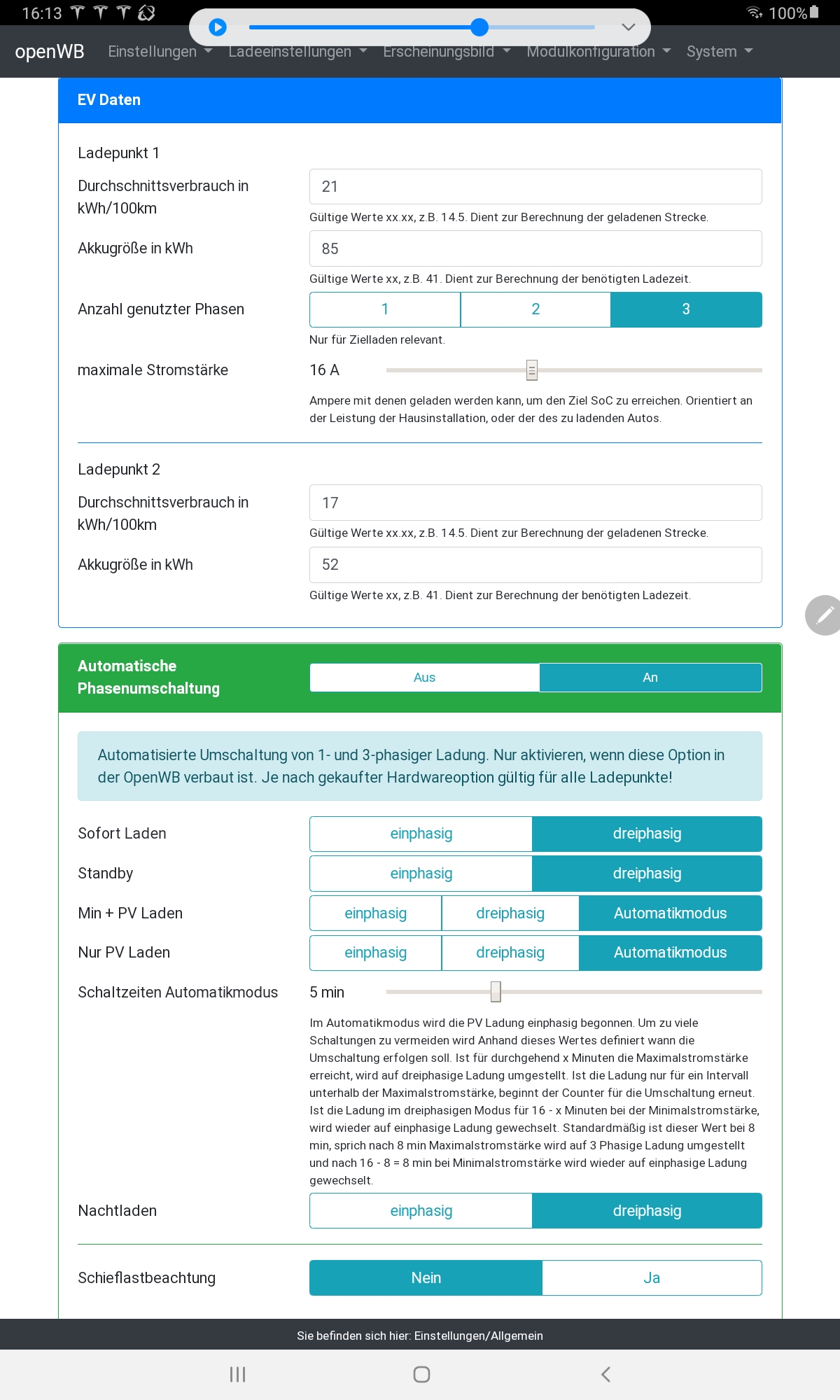 Selbst wenn ich auf SofortLaden mit eingestellten drei Phasen gehe, lädt er nur mit einer Phase.