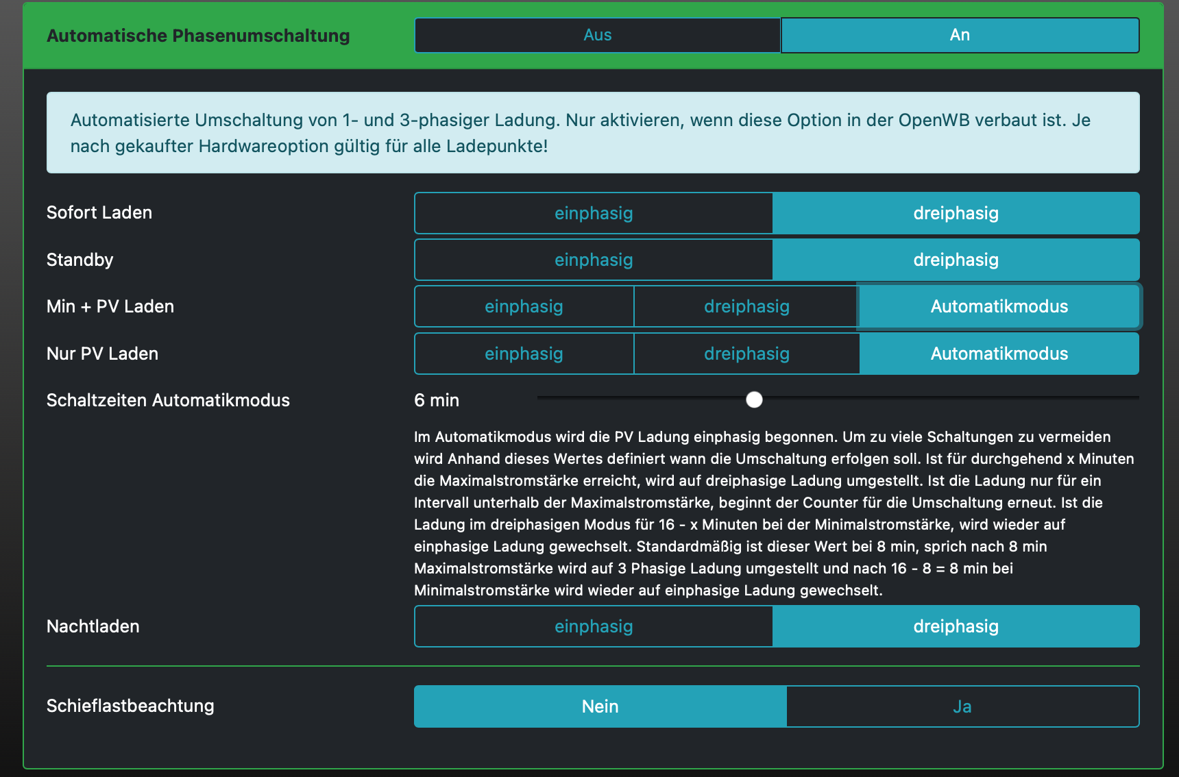 Die Option "automatische Phasenschaltung" steht auf "An" und der automatikmodus für PV ist aktiviert?