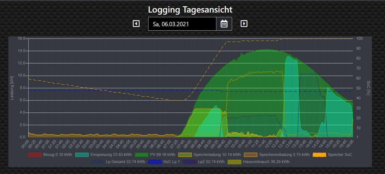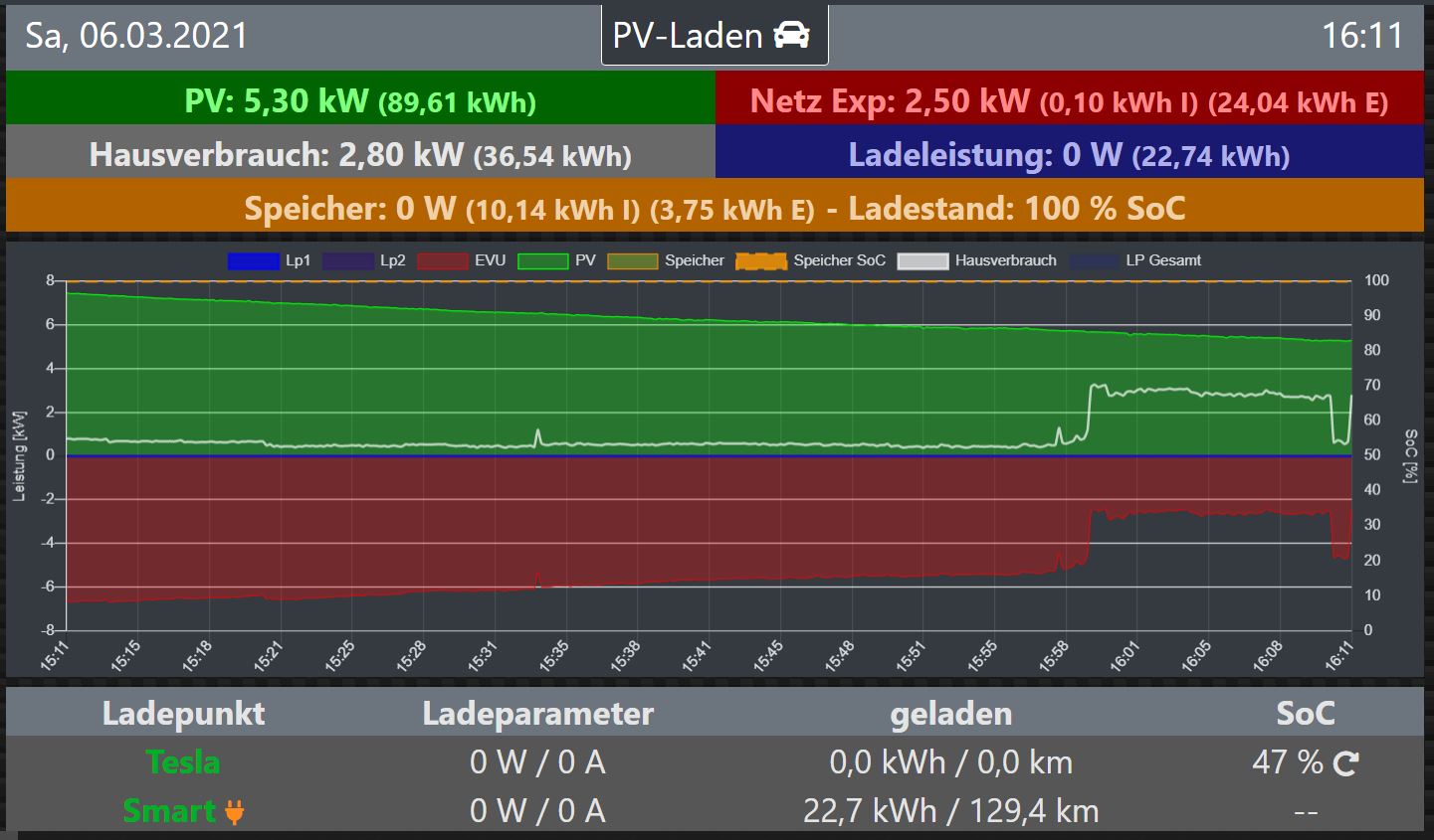 Habe gegen 10 Uhr beide Fahrzeuge eingesteckt. Der Smart hat mit 3,6 kW auf LP2 geladen. Der Tesla auf dem LP1 mit ca. 10 kW. Das wurde so aber nicht angezeigt. Dafür hatten wir diese Leistung plus ein paar hundert Watt Hausverbrauch alles im Hausverbrauch drin (graue Kurve). Das ist ja nicht richtig. Wenn ich ein Fahrzeug auf LP1 einstecke sollte das auch als Kurve angezeigt werden. Auch sieht man auf der App dann unten bei der Summer der geladenen kWh steht null, was ja nicht richtig ist.