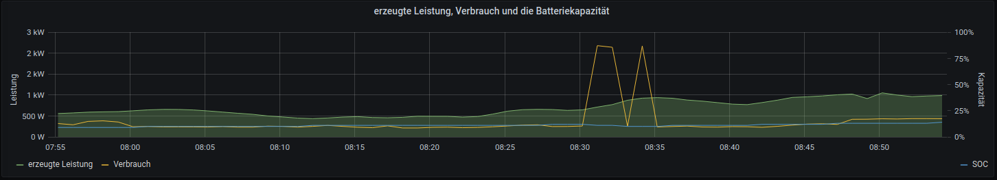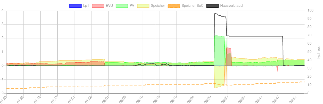 Es wird Strom dem Batteriespeicher entnommen (gelbe Fläche unterhalb der X-Achse). Scheinbar wird das dann sowohl der grünen Fläche "PV" sowie dem Hausverbrauch (schwarze Kurve) hinzugefügt. Ab 08:50 ist dann der Hausverbrauch bei 0, was bei meinem Haus aus technischen Gründen nicht sein kann.