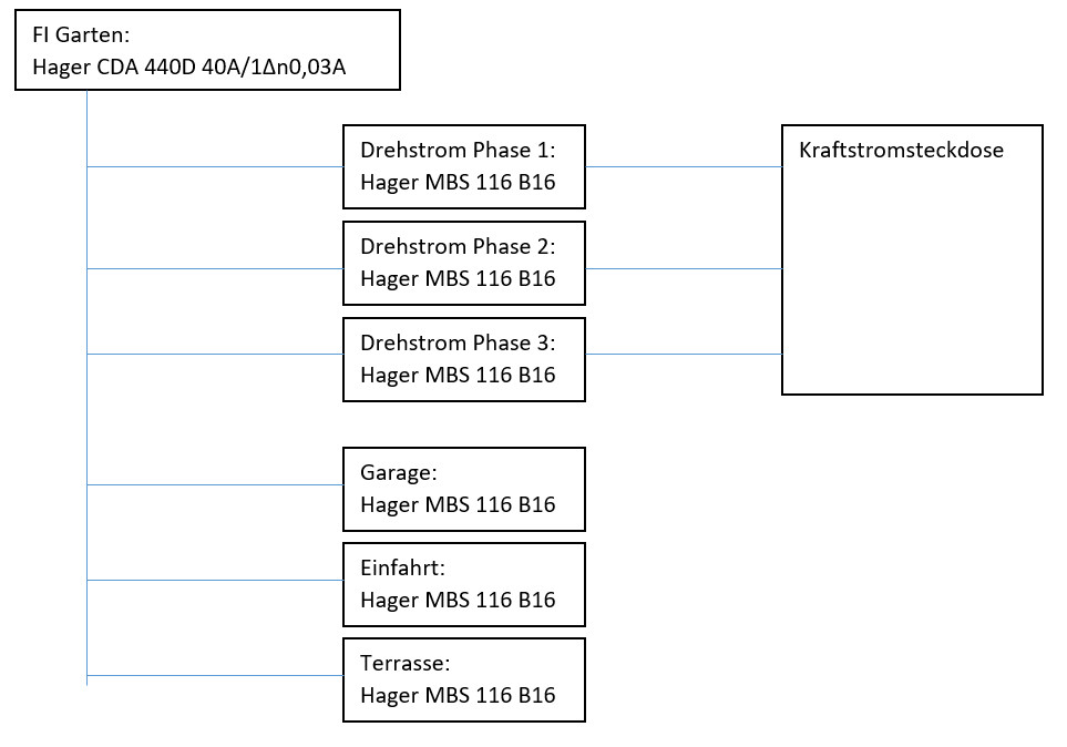 ich plane gerade eine openWB in meiner Garage einzubauen. Um dem Elektriker meine Wünsche genau zu sagen würde ich vorher gerne schon mal einen möglichst genauen Plan machen wie man das am Besten anstellt. Aktuell sind die Gegebenheiten folgendermaßen: Im Schaltkasten sitzt für alles außerhalb des Hauses ein FI (Hager CDA 440D 40A/1Δn0,03A) an dem die Leitungen in den Garten usw. dranhängen. In der Garage habe ich eine rote Kraftstromsteckdose die mit 3x16A abgesichert ist. Das Kabel bis zur Kraftstromsteckdose ist ein ca. 10m langes 5x2,5mm² Kabel. Ich möchte kein neues Kabel verlegen, da mir das Graben zu aufwendig ist und die vorhandene Leitung zur Kraftstromsteckdose nutzen. Ich würde auch gerne durch eine Abzweigung oder so weiterhin die Kraftstromsteckdose in der Garage nutzen können. Dies geschieht extrem selten und natürlich nicht parallel zum Laden an der Wallbox. Aber ab und zu hab ich mal einen Häcksler der darüber läuft.
