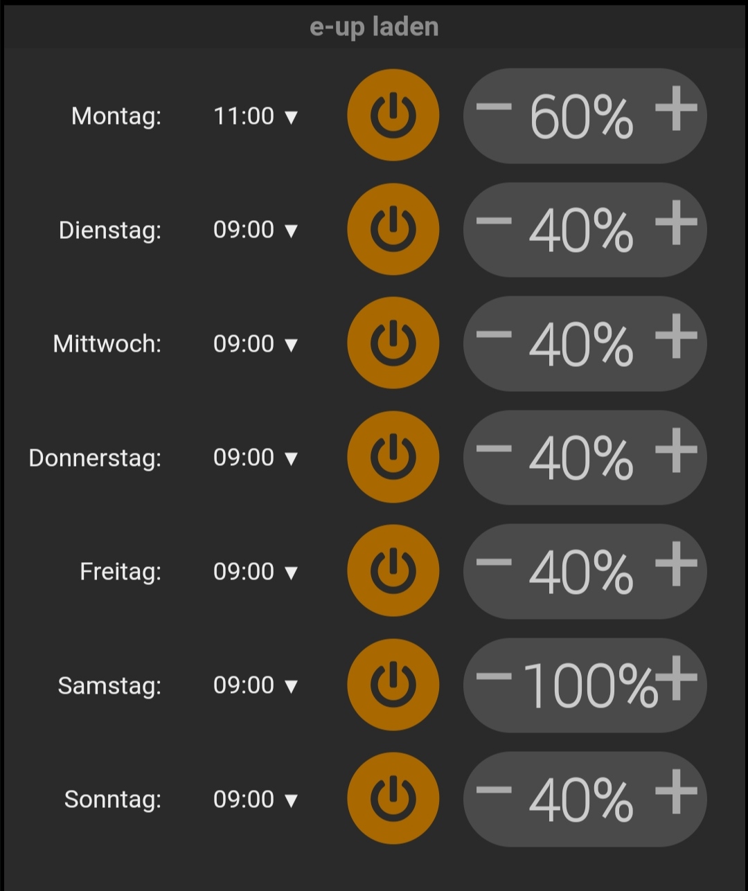 Die Startzeitplanung mit sogar genau dem gleichen Layout hab ich mir in FHEM gebastelt. Ich lade normalerweise nur mit PV-Überschuss und das immer bis 80%.