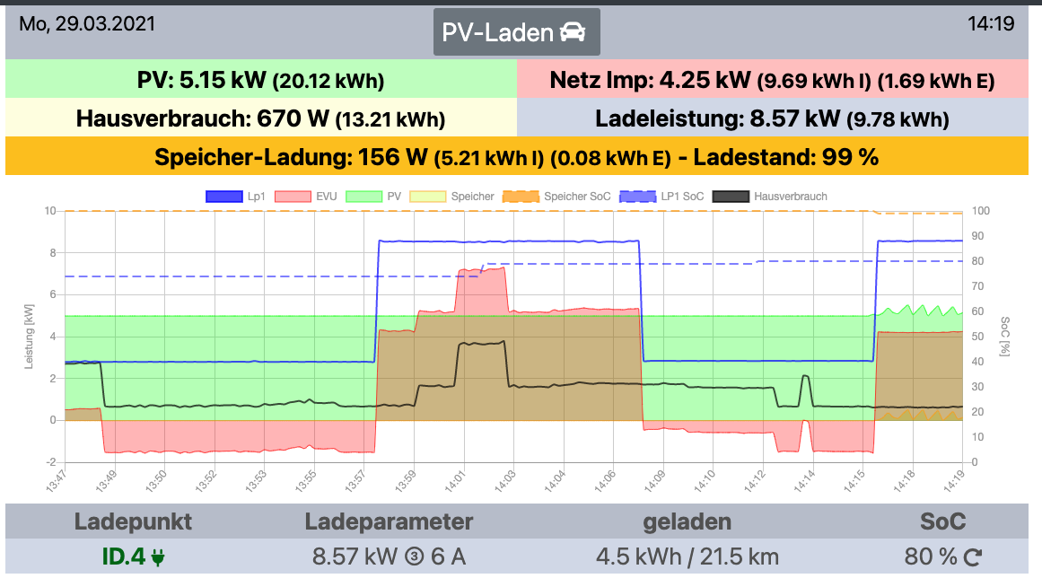 Wie im Bild zu sehen ist, habe ich im Modus "PV-Laden" Überschuss und der Hausspeicher ist voll.