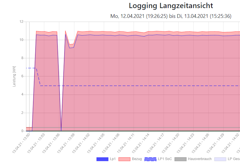 2021-04-13 16:37:35: LP1, Lademodus Sofort. Ladung geändert auf 14 Ampere, Lastmanagement aktiv (LV0)