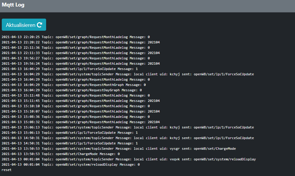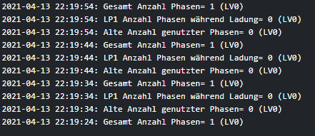 2021-04-13 16:40:45: LP1, Lademodus Sofort. Ladung geändert auf 16 Ampere, Lastmanagement aktiv (LV0)
