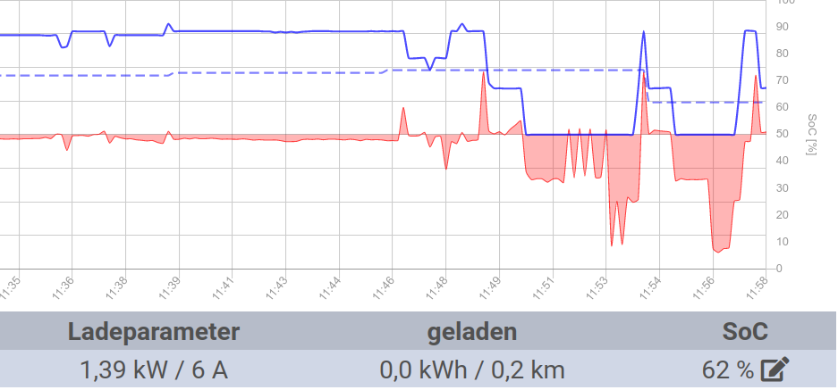 Es funktioniert eigentlich ganz gut, allerdings "springt" der SoC mit jeder geladenen kWh auf den nächsten Wert.philipp123 hat geschrieben: So Aug 29, 2021 8:41 am Die ich bei meinem e-Up den We-Connect-Dienst vermutlich nicht verlängern werde, habe ich mir gedacht, dass ich bereits jetzt schon meinen genutzten Ladepunkt auf Manuell + Berechnung umstelle um die richtigen Parameter zu finden und mich mir der Funktion anzufreunden. Den "Live"-SOC habe ich jetzt einfach mal auf meinen 2. zumeist ungenutzten Ladepunkte eingestellt, damit ich dort einfach die Werte abrufen und vergleichen kann.