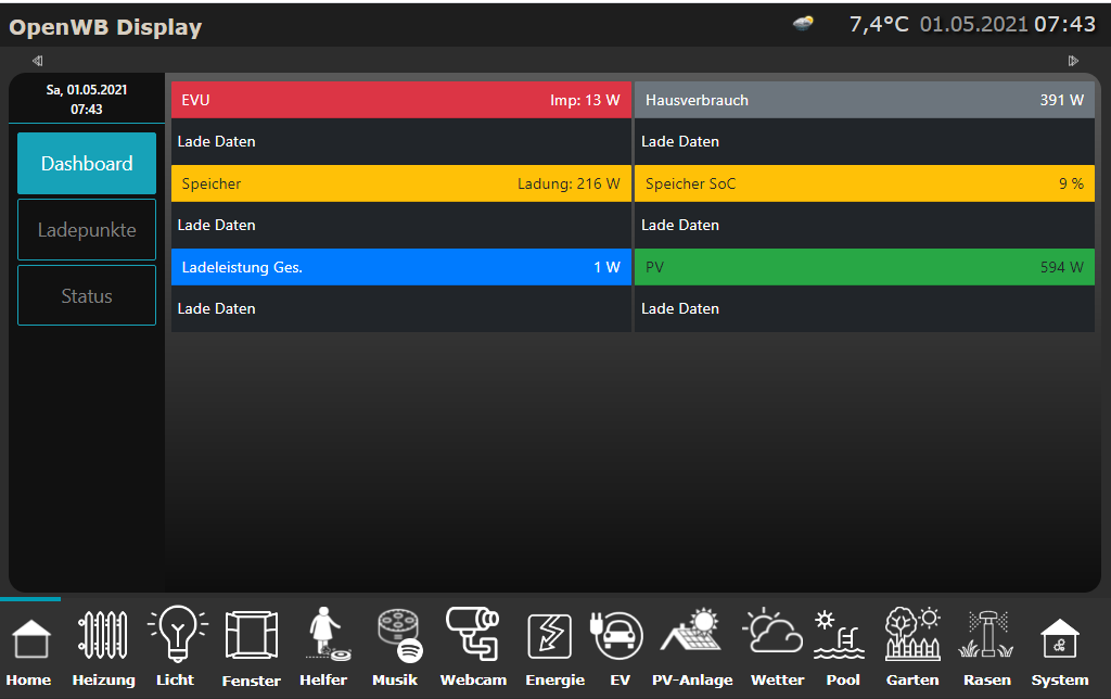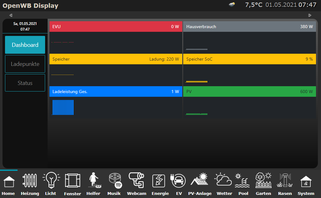 Der Unterschied ist, dass am Display der openWB die Seite durchgehend angezeigt wird. Die startet auch mal ohne Balken und füllt sich dann mit der Zeit. Anscheinend lädt ioBroker die Seite neu, wenn Du darauf wechselst. Daher sind dann auch keine historischen Daten vorhanden.