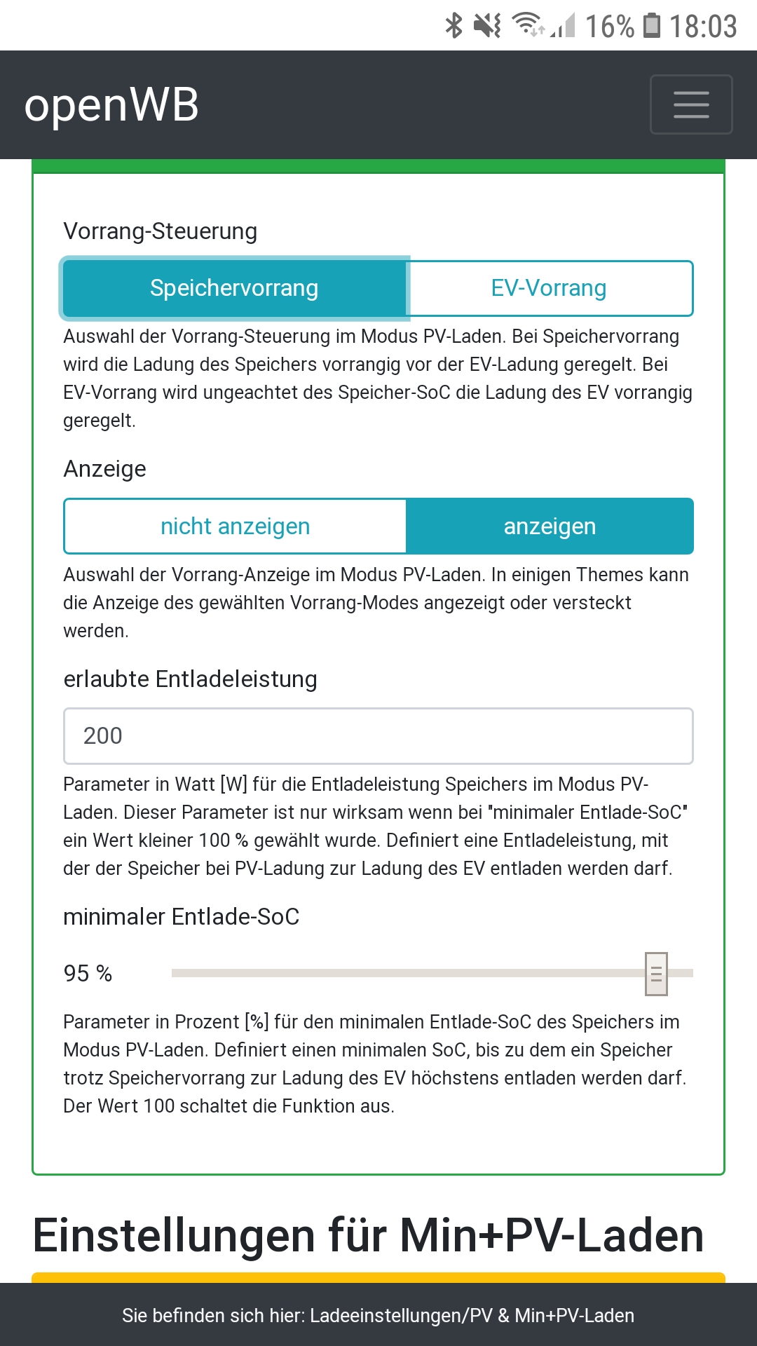 ich würde Dir ja gern helfen, aber Du schreibst immer von "Nur PV- Laden" und stellst Deine Einstellungen für "Min+PV" hier ein.