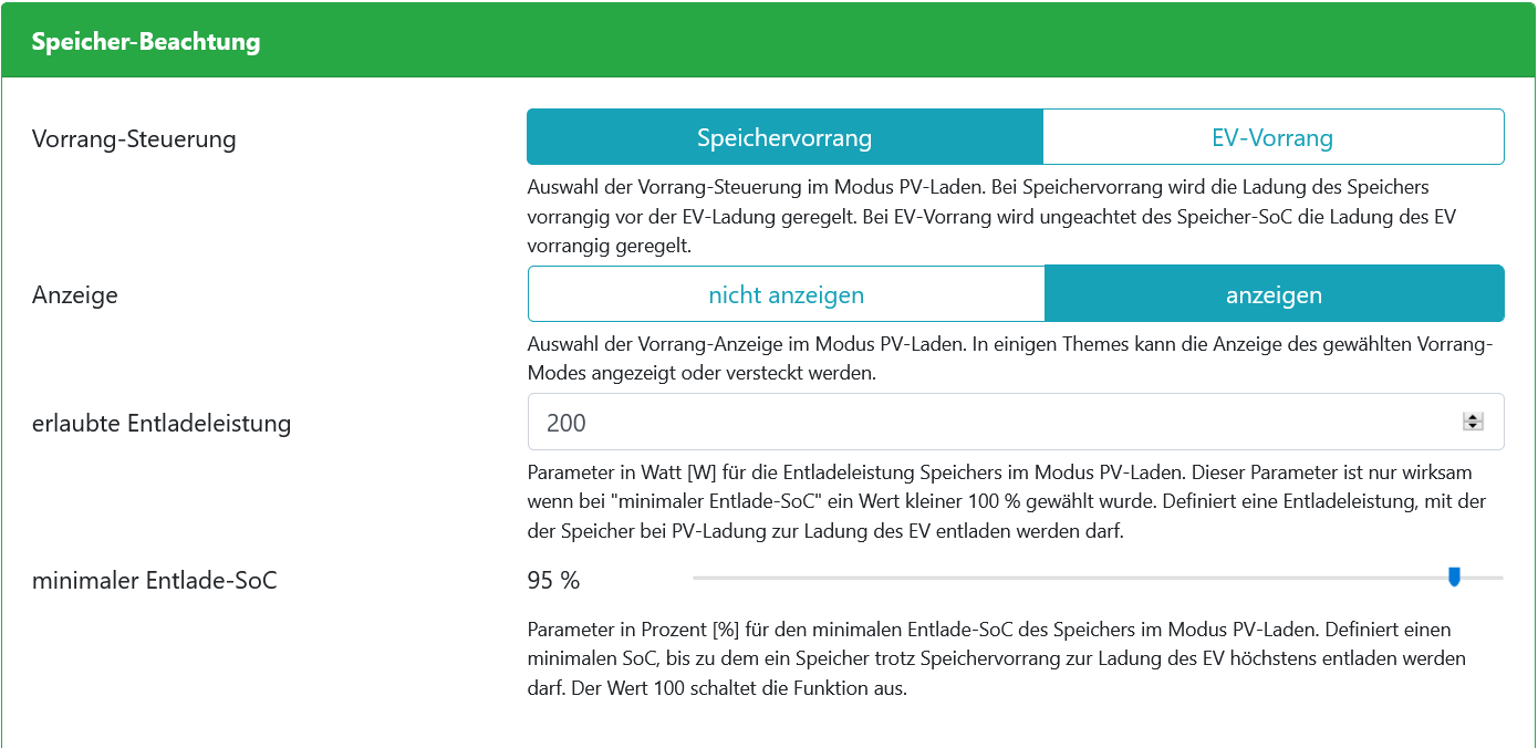Bei grau solltest Du auf "Einspeisung" stehen haben: Dann für "nurPV" passt es eigentlich, Abschaltzeit solltest Du runternehmen: und weiter, wenn Du "Speichervorrang" möchtest, z.B. max. 200 W Entladung: oder eben als EV- Vorrang mit z. B. 500 W Speicherladung während der EV- Ladung: Wenn diese Einstellungen soweit i.O. sind sollte es grundsätzlich funktionieren. Alle Werte kannst Du individuell auf Dich anpassen.