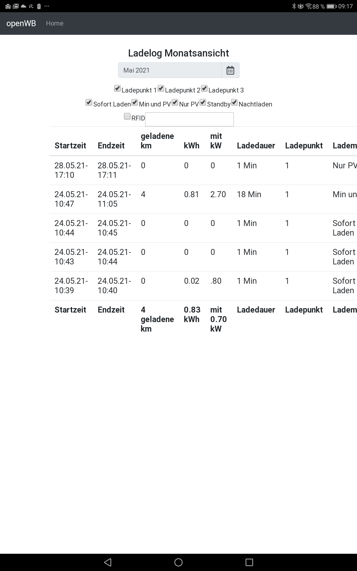 Nach der zuletzt aufgezeichneten Ladung am 28.05. hat direkt danach eine weitere Ladung stattgefunden. Auch gibt es bereits einen abgeschlossenen Ladevorgang und einen laufenden.