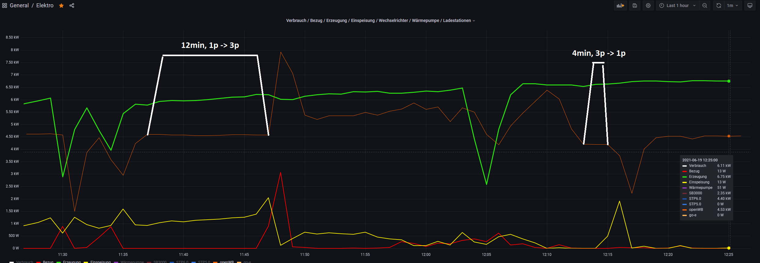 12min lang bleibt openWB bei 1p und max. 20A, dann wird umgeschaltet mit einem kleinen Überschwinger auf 11kW.