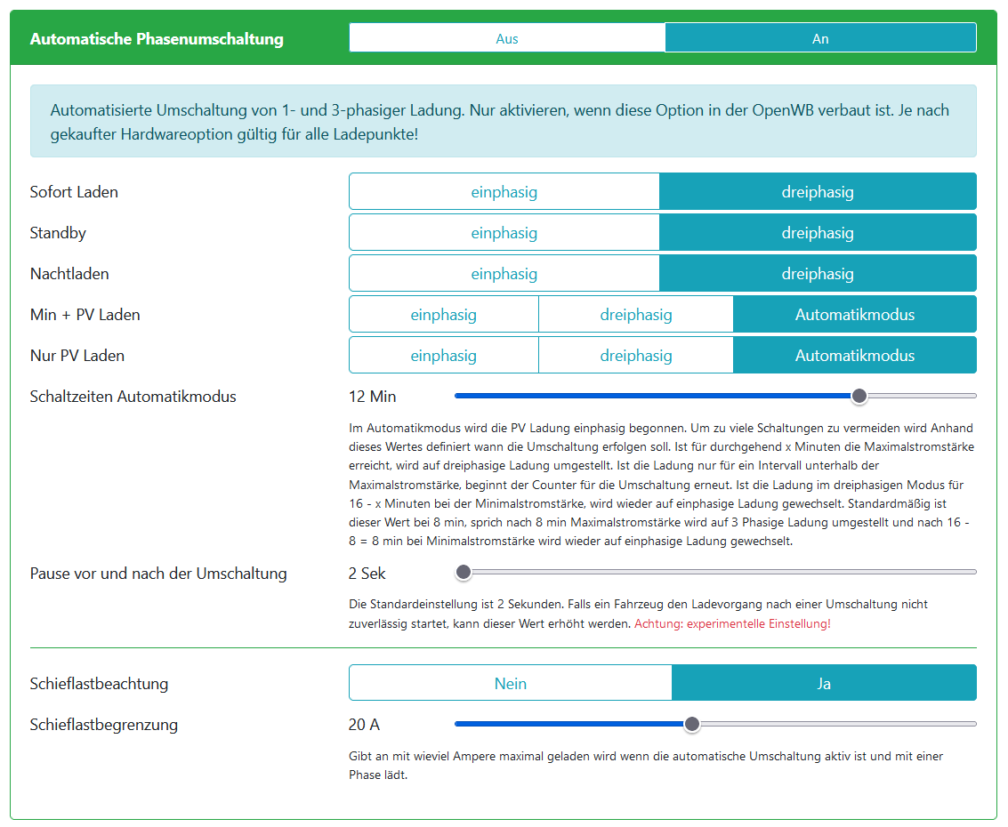 Standardmäßig ist dieser Wert bei 8 min, sprich nach 8 min Maximalstromstärke wird auf 3 Phasige Ladung umgestellt und nach 16 - 8 = 8 min bei Minimalstromstärke wird wieder auf einphasige Ladung gewechselt.