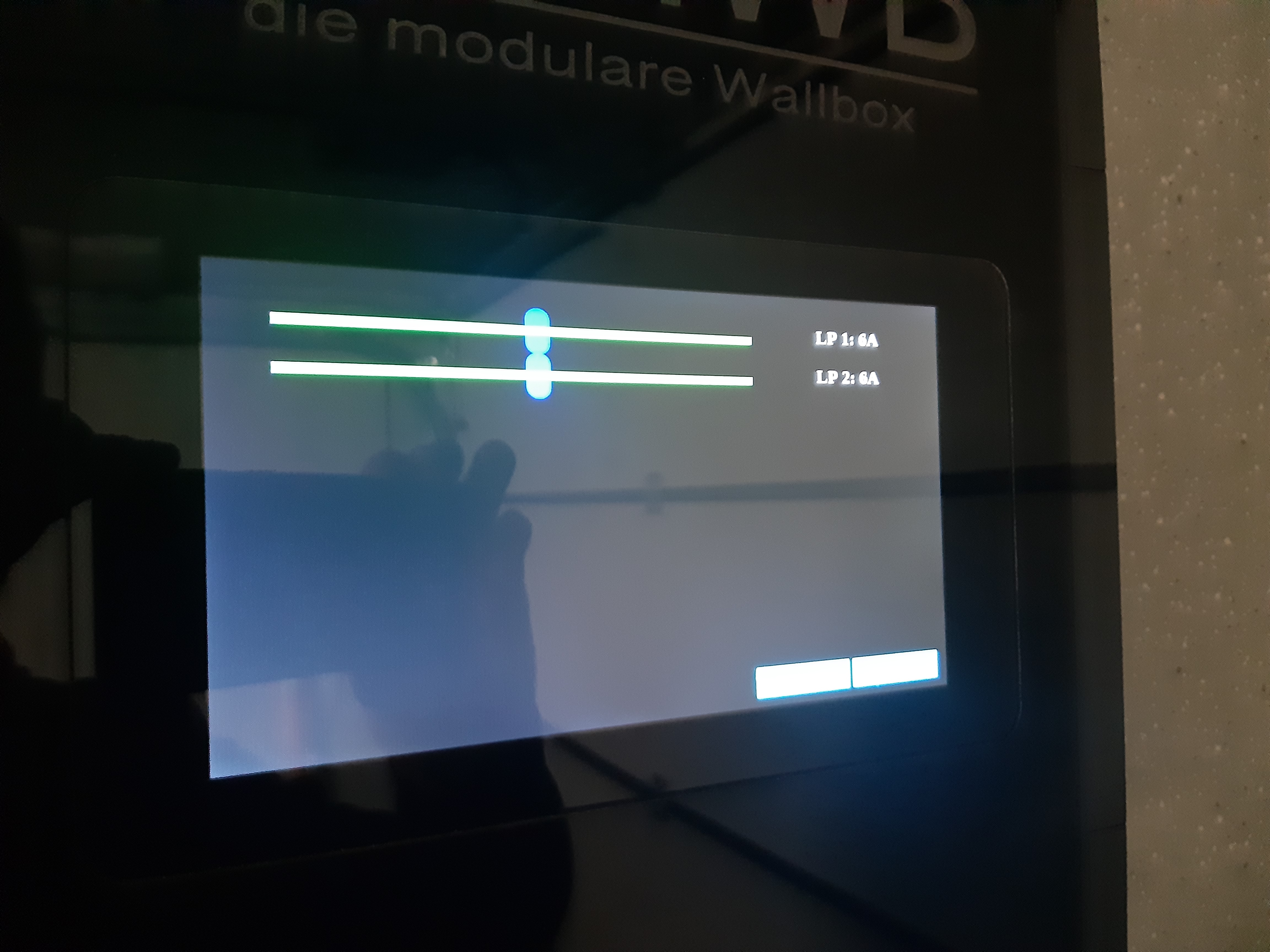 1) Geht man auf Ladestrom, so erscheinen zwei Schieberegler. LP1 steht bei 16A, LP2 steht bei 6A (übrigens zwischen Einheit und Zahl gehört immer ein Leerzeichen!). Dennoch sind beide Schieberegler mittig.