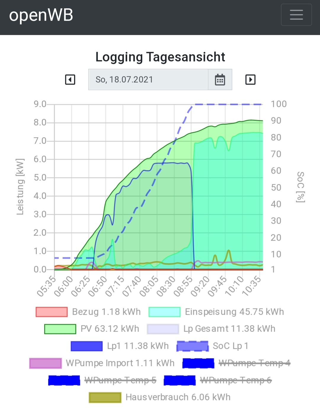 Ca. 7:00 Uhr hat die Box an dem kleinen Haken nach unten dann auf 3p umgeschaltet und ab da sind dann bei 3x16A die 11kW möglich. Bei mir kann der Hybrid nur 2p laden, und ich hab auch auf Grund meiner Zuleitung auf 13A begrenzt. Daher ist mein Maximum bei 5,8kW, auch wenn mehr PV Leistung vorhanden wäre.