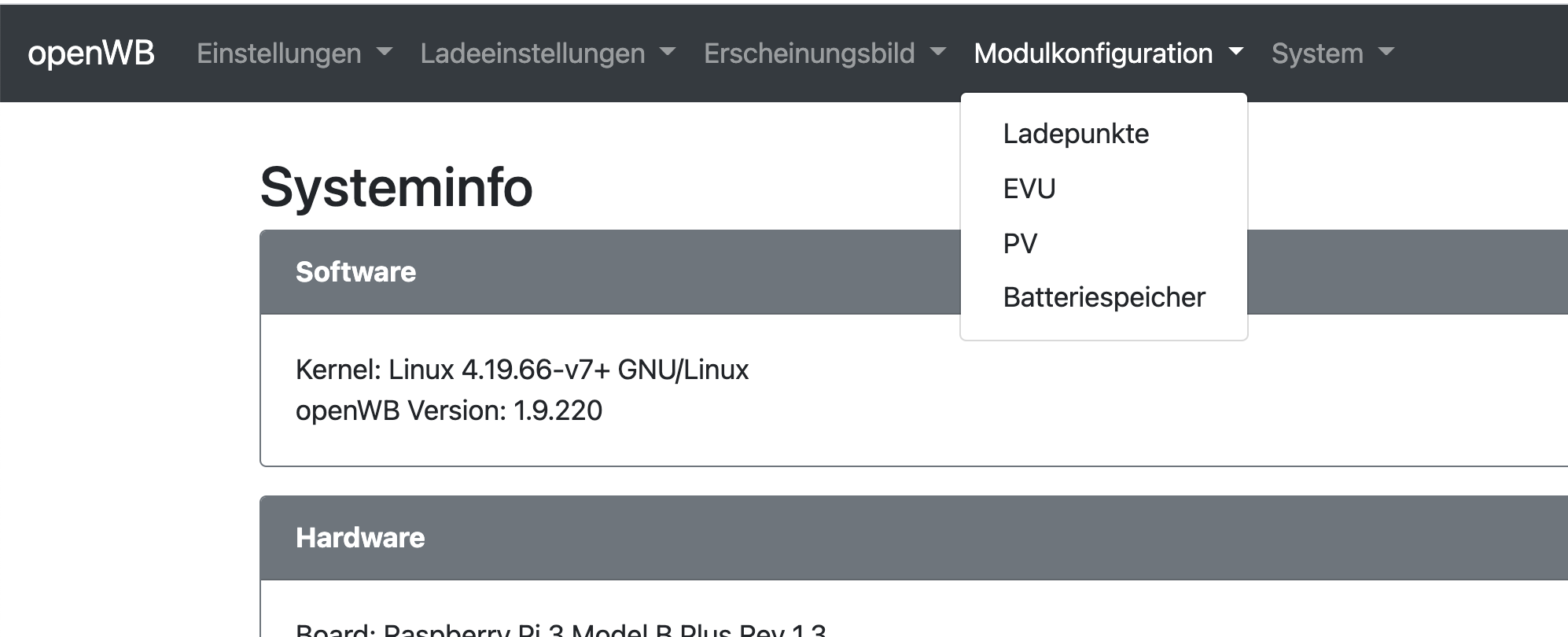 ich habe vor kurzem eine OpenWB series2 standard+ mit der Version 1.9.220 von meinem Elektriker eingerichtet bekommen. Im Forum hab ich jetzt hier etwas von einem SOC Modul gesehen wo ich die Einstellugen von meinem Fahrzeug einstellen kann. Ich finde in der Oberfläche aber keinen Einstellpunkt das zu tun. Mein Menü sieht wie folgt aus. Fehlt da irgendwas? Wie komme ich an die Fahrzeugeinstellungen ran?
