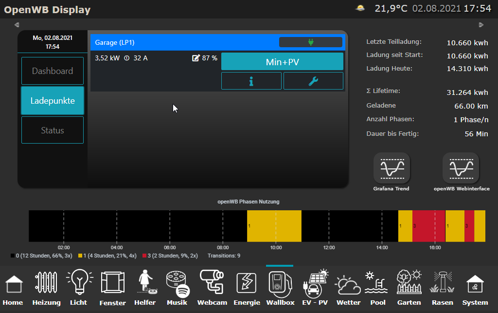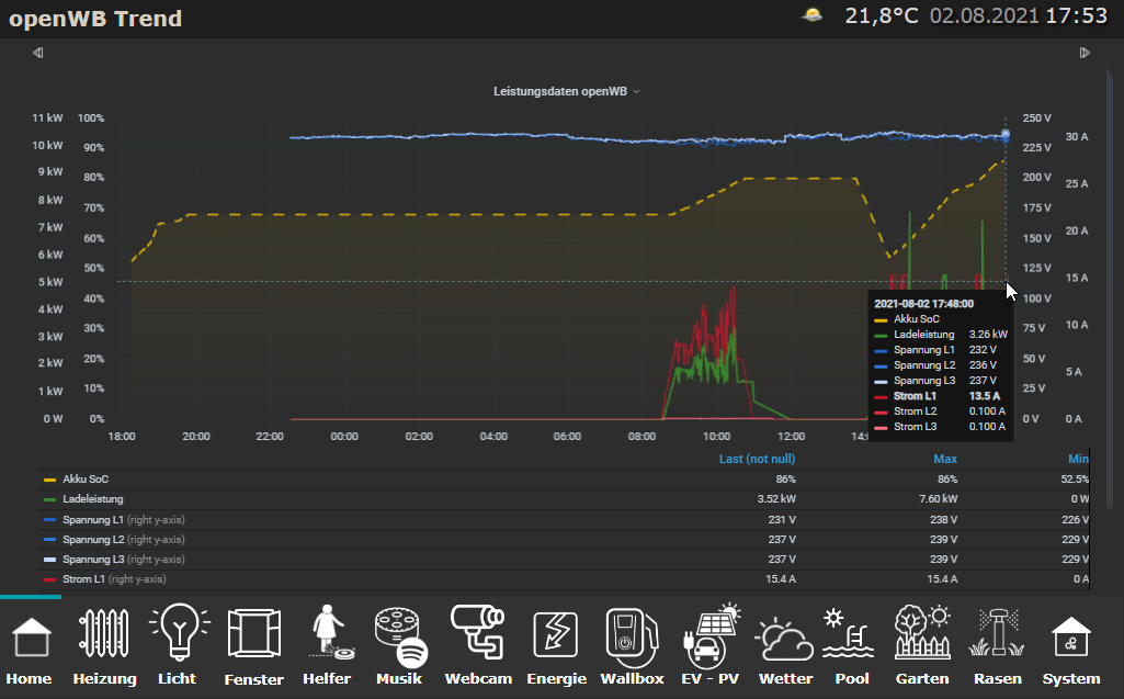 Konkret geht es dabei um das Cards Theme, welches mir bei den Ladeparametern 1-Phasig 32A angezeigt hat. Da ich über MQTT die Ladeparameter in Grafana mit schreibe, habe ich das mal schnell überprüft und dabei habe ich festgestellt, das real nur ~14 A gezogen wurden.