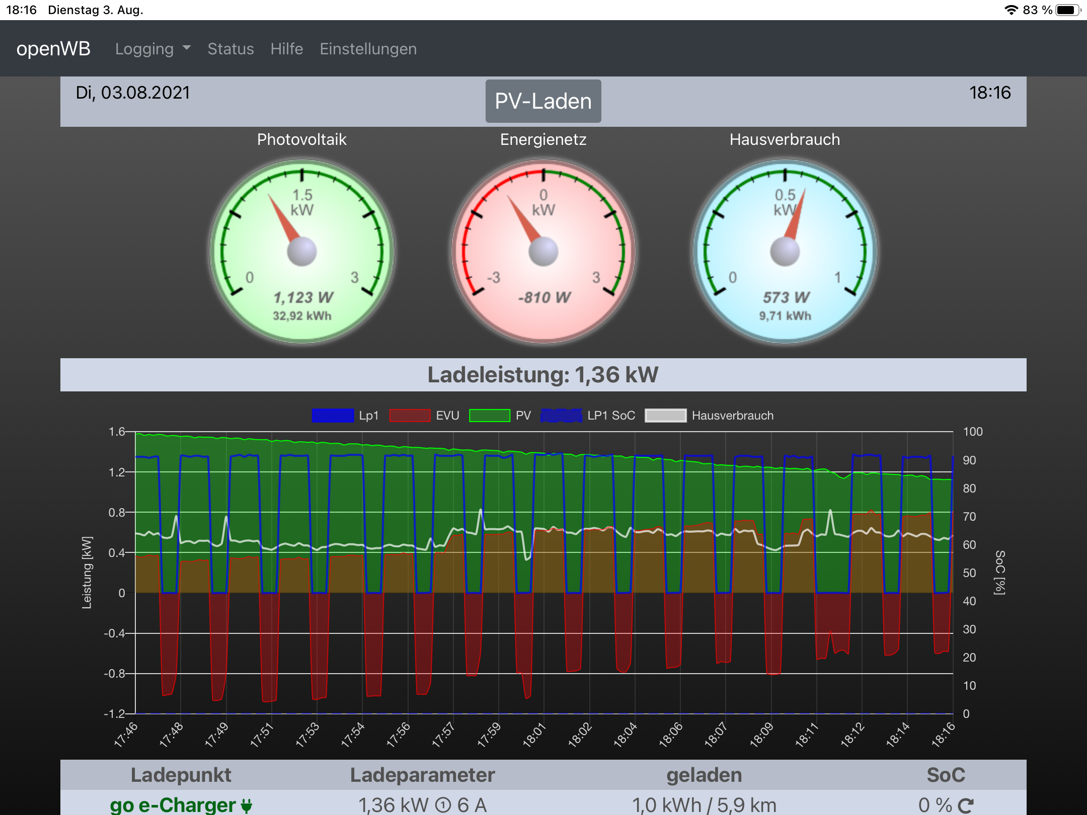 Bei ca. 600 W Hausverbrauch und ca. 1900 W PV würde er dann mit dem eingestellten Überschuss für 1p starten.