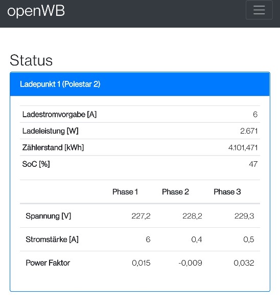 Und hier die falsche Anzeige (zeigt nur 1 Phase an, obwohl auf zwei geladen wurde: