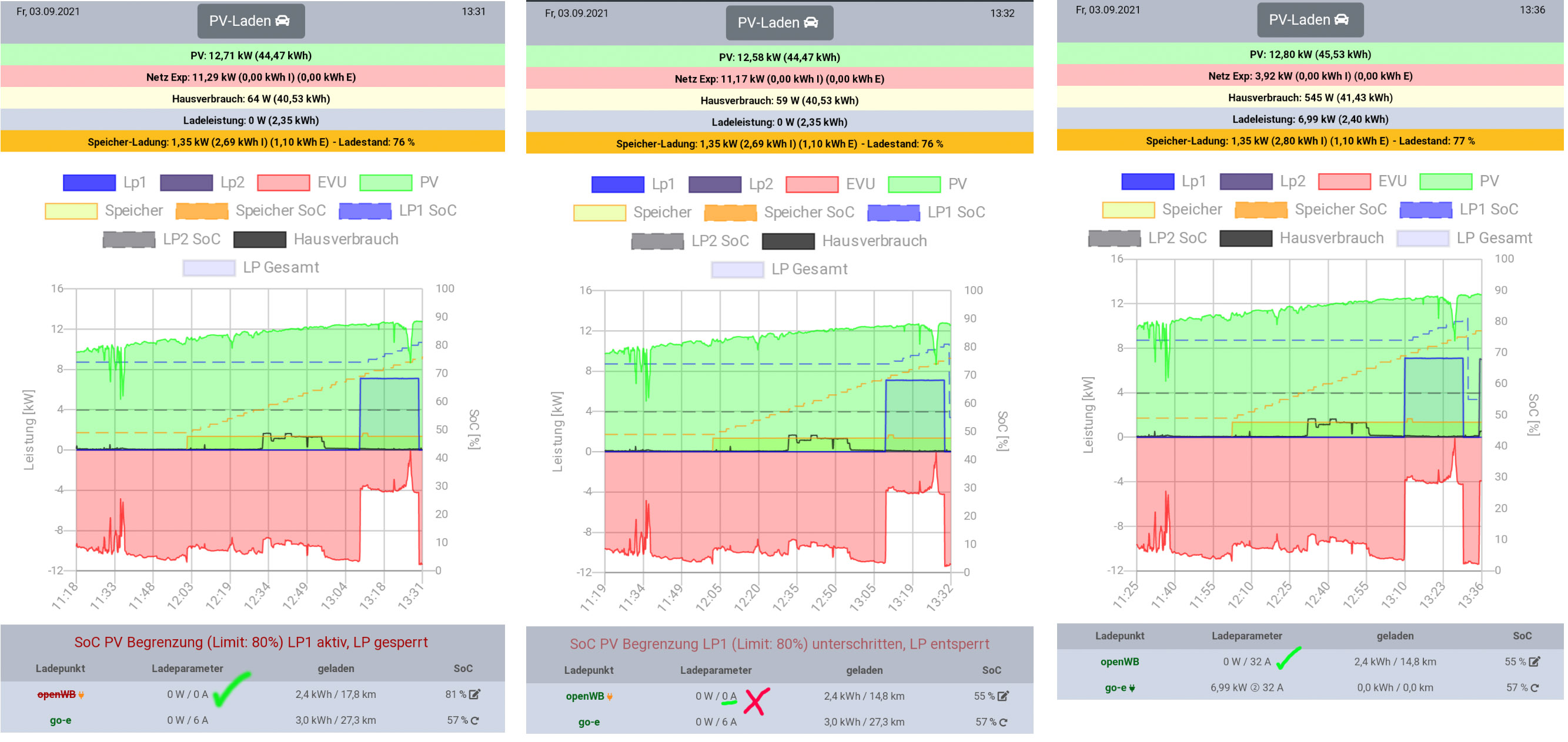 2021-09-02 14:39:56: LP1, Lademodus NurPV. Schalte Ladepunkt frei da 50 % SoC noch nicht erreicht, Ziel 80 % (LV0)
