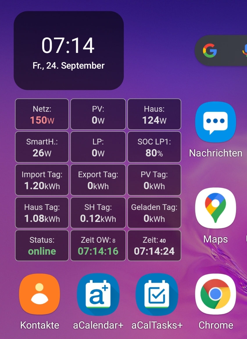 Inspiriert durch viewtopic.php?f=6&t=2354 hat sich bei mir der Wunsch entwickelt, ein Widget für Android zu haben, um die Live-Daten der openWB zu monitoren, so lange ich daheim bin. Und das, ohne jedes mal die "App" aufmachen zu müssen.
