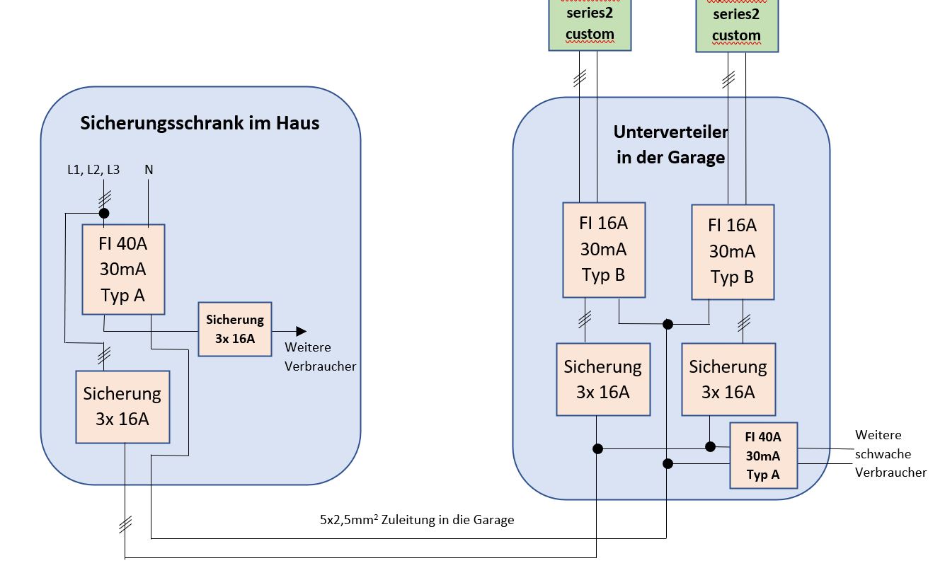 Und zwar habe ich leider in die Garage nur ein 5x2,5mm2 liegen, also geht insgesamt nicht mehr als 11kw.