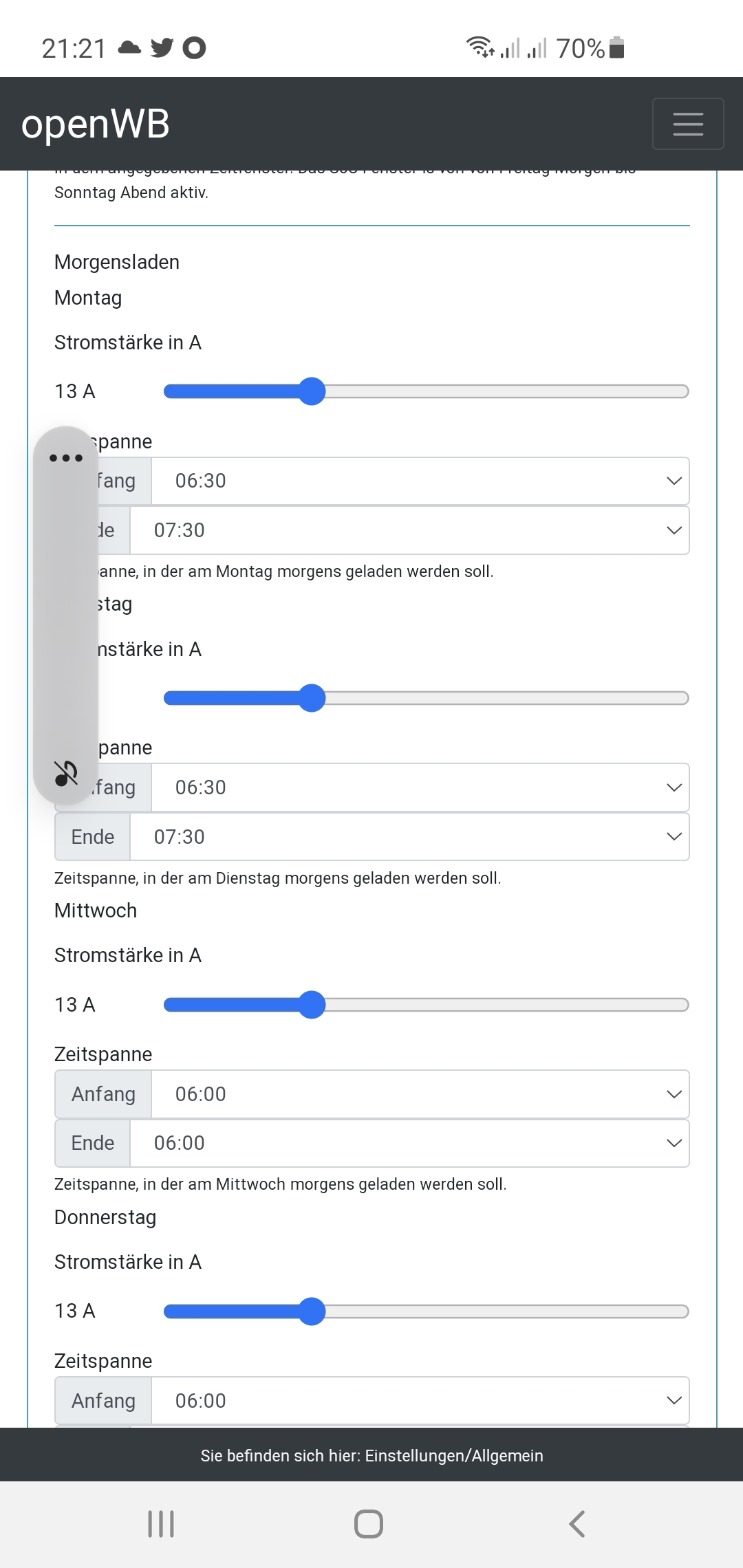 Das hängt auch ein bissl vom Auto ab. Wir haben hier einen Ion (c-Zero IMIEV) der macht die Heizung nur an, wenn er am Strom hängt und der SoC 100% ist. Ein Tesla heizt vor, solange der SoC noch über 20% ist. Für den Ion wird nachts geladen, damit der morgens voll ist. Morgens geht der Strom zu Laden wieder an, damit die Heizung funktioniert. Die Heizung selbst muss ja immer manuell angestoßen werden, das macht die openWB ja nicht. Beim Tesla ist kein Nachtladen aktiv, der nimmt immer den Überschuss ab bis er voll ist. Auch den Tesla heize ich manuell vor. Der macht das aber auch, wenn er nicht am Strom hängt.WBauer hat geschrieben: Mi Nov 17, 2021 7:31 am D.h., ich muss das Auto in einem Zeitraum laden (obwohl ich das evtl. gar nicht will) in dem ich das Vorheizen voraussichtlich starten werde. Bei unregelmäßigen Abfahrtszeiten muss das dann täglich angepasst werden.
