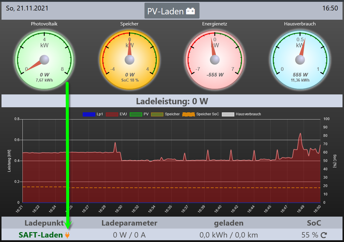 Wenn genügend Überschuss da ist, wird der Stecker grün. Z.B. bei Umstellung auf Min+PV.