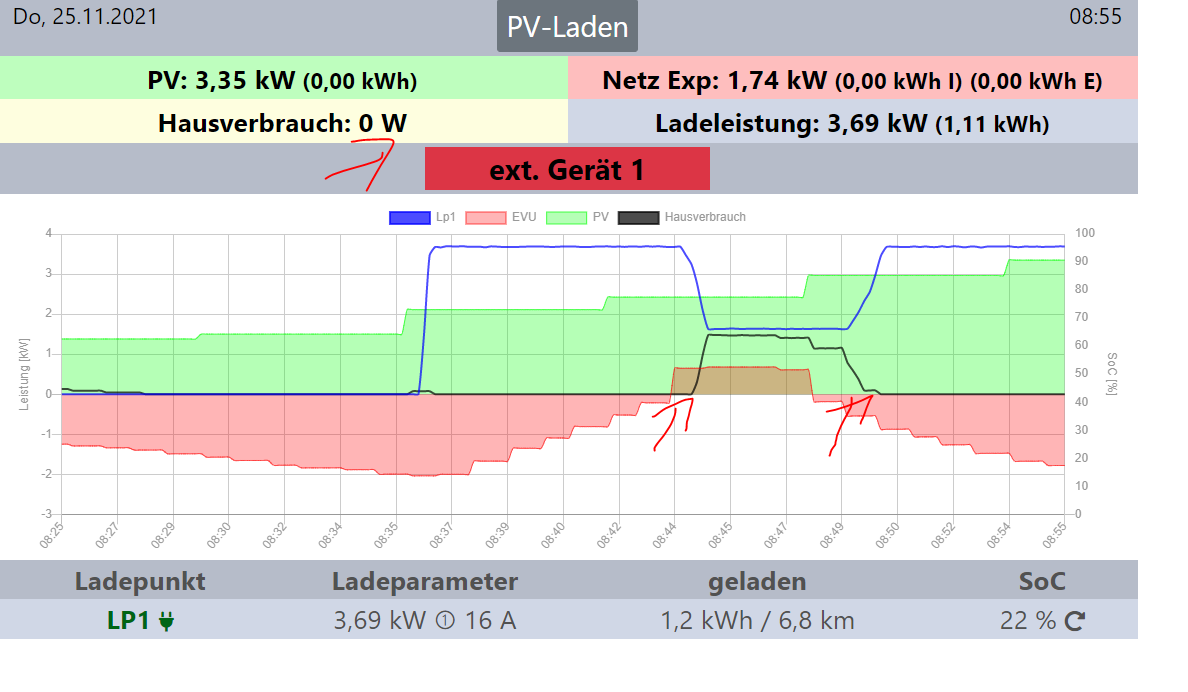 Ich verstehe den Zusammenhang zwischen Hausverbrauch und Ladekurve nicht. Ich habe in einem Thread gelesen, dass es auch keinen gibt - bei mir aber scheinbar schon. Immer wenn der Hausverbrauch auf 0W fällt (was natürlich NICHT so ist) steigt die Ladekurve massiv an um dann nach der Hysterese-Zeit wieder abzuflachen. Kann mir jemand erklären warum das so ist? Gebe ich den Hausverbrauch fix mit z.B. 2KW an funktioniert alles wie es soll. Mein erster Verdacht waren Lastspitzen durch andere Verbraucher - das habe ich mittlerweile aber ausgeschlossen. Auch habe ich mit Mittelwerten experimentiert (5Min, 10min, 2Min) - sieht immer gleich aus nur die Kurven werden enger oder weiter.