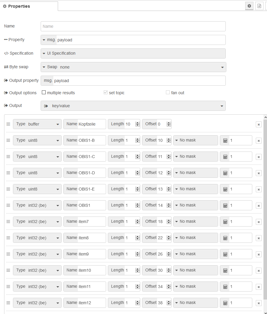 Du nimmst den Buffer Parser Node und definierst die Felder aus der Spezifikation, auch in Teilen, zB mal fürs Erste:
