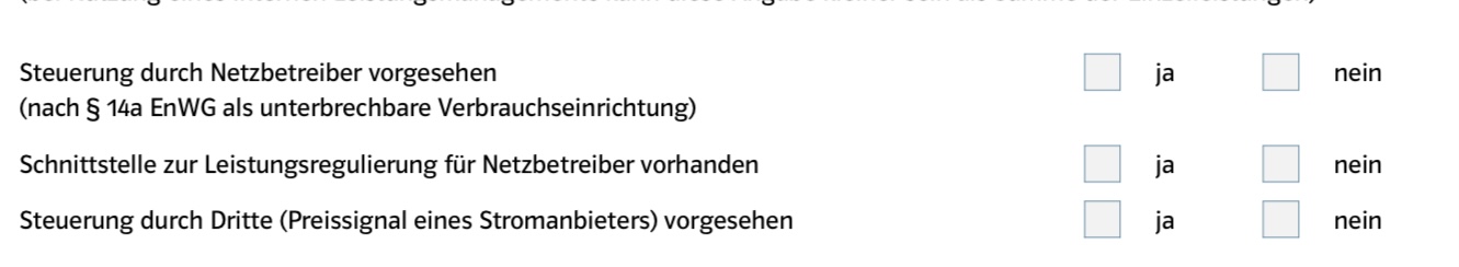 Bei meinem VNB (Westnetz) konnte ich wählen, ob ich einverstanden bin oder nicht, "dass die errichtete Ladeeinrichtung für Elektromobilität im Sinne des § 14 a EnWG durch die Westnetz bei Bedarf netzdienlich gesteuert wird." Also Infotext bei "ja" stand dort: "In der Ladeeinrichtung wird in diesem Fall für jeden Ladepunkt eine moderne Messeinrichtung zur Inanspruchnahme des reduzierten Netzentgeltes durch Ihren Installateur installiert. (siehe § 14 a EnWG). Wir behalten uns vor, die Steuerung der Ladestation nach § 14 a EnWG in einer gesonderten Vereinbarung zu konkretisieren."