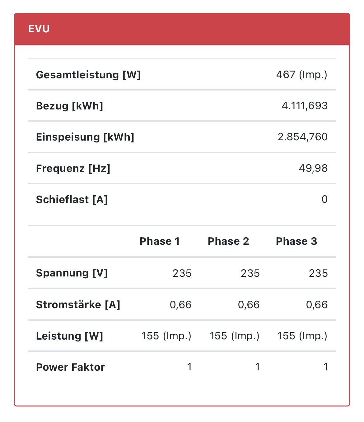 Die Sonnenbatterie liefert keine separaten Werte je Phase. Die dargestellten Spannungen und Ströme sind daher eher theoretischer Natur.aiole hat geschrieben: Mi Dez 08, 2021 5:54 pm EVU-Punkt (rot):