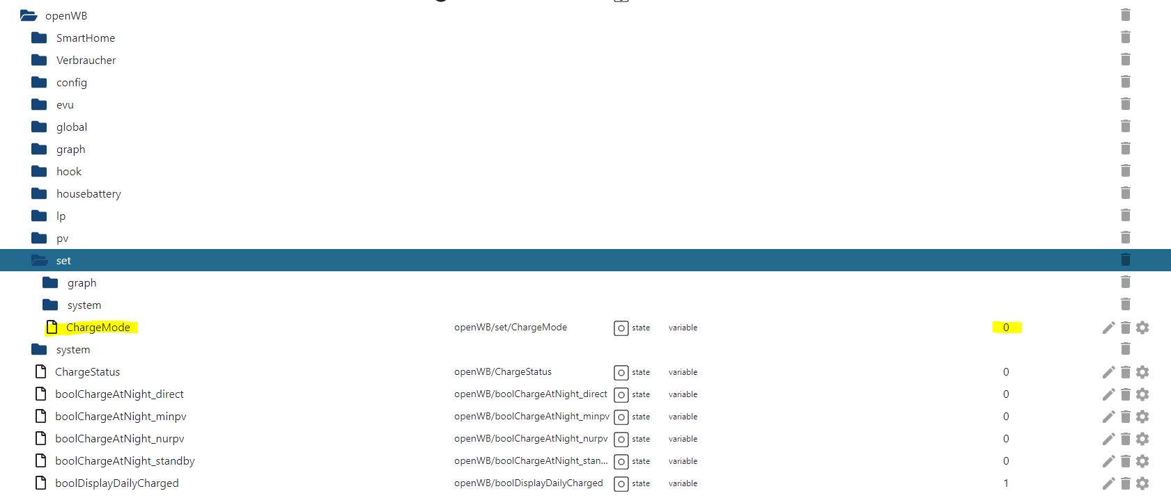 Wenn ich jetzt den Wert openWB/set/ChargeMode ändere, kommt die Änderung aber nicht bei der OpenWb an.