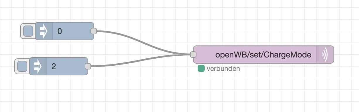 [{"id":"6c76caae.65dee4","type":"tab","label":"Flow 2","disabled":false,"info":""},{"id":"5503e017.e3572","type":"inject","z":"6c76caae.65dee4","name":"","props":[{"p":"payload"},{"p":"topic","vt":"str"}],"repeat":"","crontab":"","once":false,"onceDelay":0.1,"topic":"","payload":"2","payloadType":"num","x":200,"y":200,"wires":[["c1808442.e83688"]]},{"id":"c1808442.e83688","type":"mqtt out","z":"6c76caae.65dee4","name":"","topic":"openWB/set/ChargeMode","qos":"","retain":"","broker":"978968c8.7b5238","x":550,"y":180,"wires":[]},{"id":"2e892f52.a41f7","type":"inject","z":"6c76caae.65dee4","name":"","props":[{"p":"payload"},{"p":"topic","vt":"str"}],"repeat":"","crontab":"","once":false,"onceDelay":0.1,"topic":"","payload":"0","payloadType":"num","x":210,"y":140,"wires":[["c1808442.e83688"]]},{"id":"978968c8.7b5238","type":"mqtt-broker","name":"OpenWB","broker":"192.168.8.11","port":"1883","clientid":"","usetls":false,"compatmode":false,"keepalive":"30","cleansession":true,"birthTopic":"","birthQos":"0","birthRetain":"false","birthPayload":"","closeTopic":"","closeQos":"0","closeRetain":"false","closePayload":"","willTopic":"","willQos":"0","willRetain":"false","willPayload":""}]