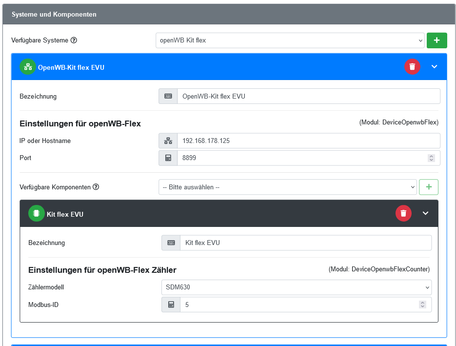 Gestartet bin ich mit der Modulkonfig. "Geräte und Komponenten" und habe dort versucht 1x EVU und 2x PV als flex einzurichten, zusätzlich (nur mal so) 4 unterschiedliche LP. Auch hatte ich zwischenzeitlich mehrmals den Mülleimer genutzt.