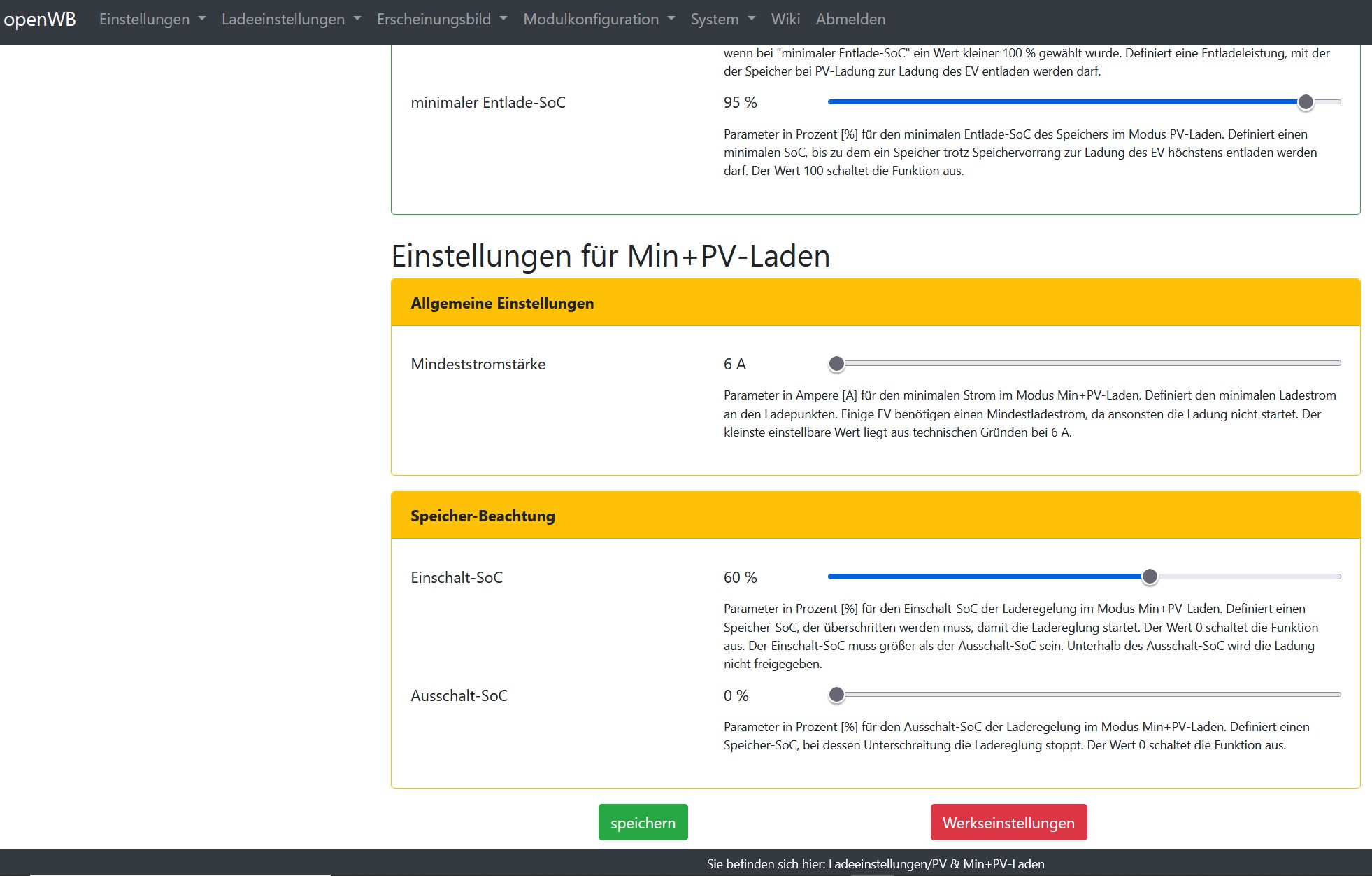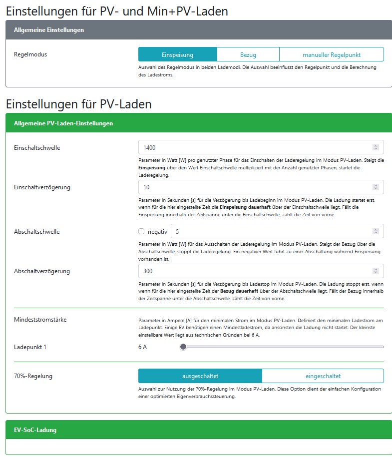 Die Einstellungen in den Bildern haben bei mir bis Ende Oktober 2021 im Modus "Nur PV" problemlos funktioniert. Seit November ist die Sonne weg und ich lade nur noch im Modus "Sofort Laden".