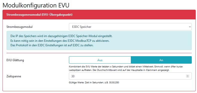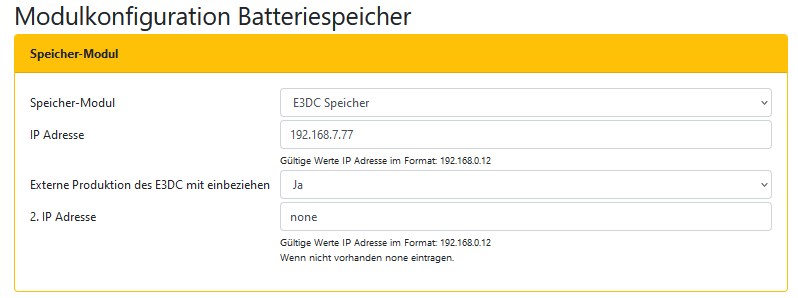 Bei mir habe ich allerdings das EVU Kit installiert, weil es damals noch kein E3DC-Speichermodul gab. E3DC hat die Schnittstelle glaube ich erst Ende 2020 ermöglicht. Deren Support ist ja praktisch nicht vorhanden. Ich hatte das E3DC-Speichermodul dann nur mal kurz probeweise konfiguriert und wieder durch das EVU Kit ersetzt, weil es nicht sauber lief. Ich meine das war im FJ 2021.