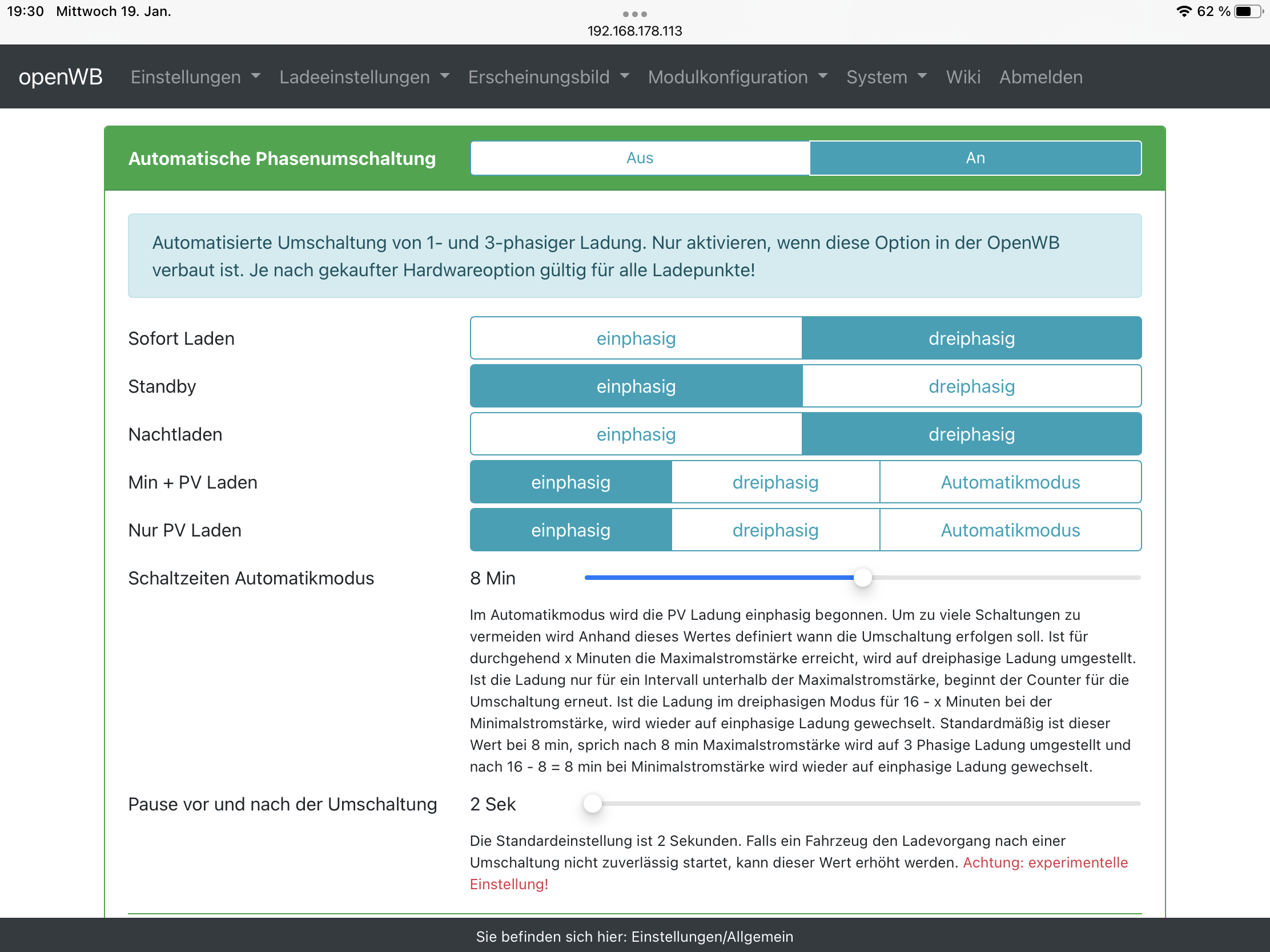 Meine Frage: obwohl ich in den Einstellungen sage beim „Sofort-Laden“ soll mit 3 Phasen geladen werden sehe ich das nur 1 Phase benutzt wird und eben nur mit 3,5 statt 11 kW geladen wird.
