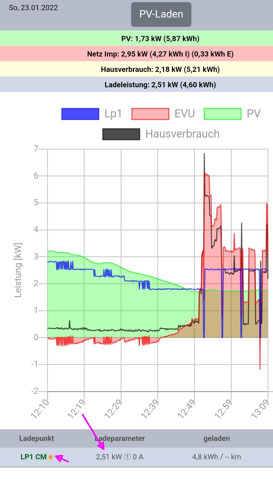 2022-01-23 12:25:19: LP1, Lademodus NurPV. Ladung geändert auf 12 Ampere (LV0)