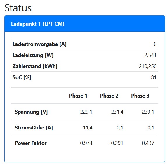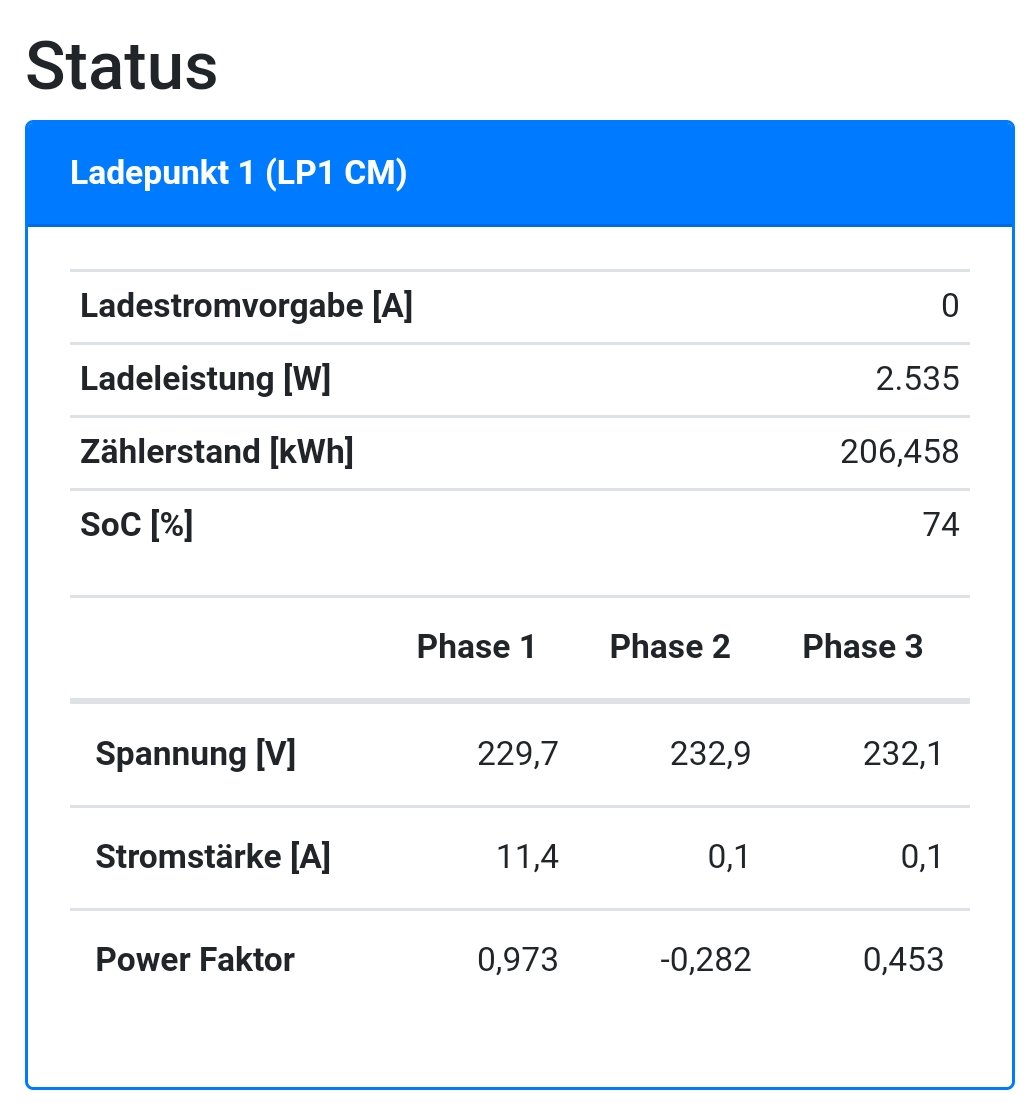 In der Anlage Screenshots. Bei den Bildern bug1.jpg und bug2.jpg sowie bug3.jpg sieht man das Verhalte sehr deutlich. Zudem habe ich einen Screenshot der Einstellungen hochgeladen. Der Mindestladestrom wurde bewusst mit 10A gewählt, damit es keine Probleme mit zu geringem Ladestrom gibt, da die Zoe immer ca. 1-1,5A weniger zieht als vorgegeben wird (aus Erfahrung). Zudem 2x ein Screenshot der Statusseite mit den Ladedaten, einmal normale Ladung - und beim zweiten Bild während des fehlerhaften "Weiterladens" mit ca. 2,5kW und der komischen Anzeige in openWB.