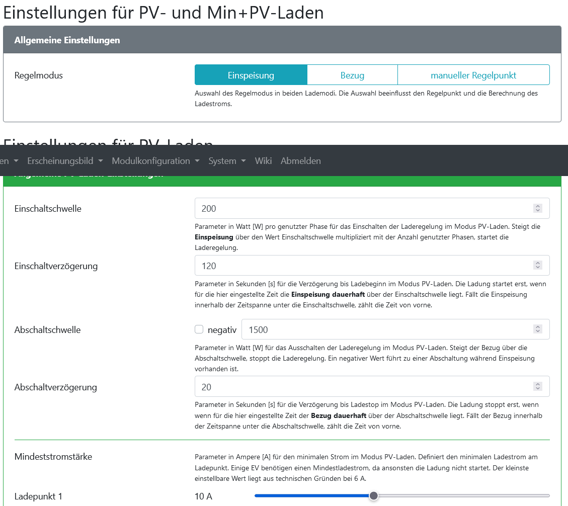 Hintergrund: Ich will den Ladebeginn direkt starten, sobald die PV einen Überschuss von ca. 300W liefert. Der Rest soll aus dem Netz kommen. Sollte das "Warum?" kommen: Einspeisevergütung nur 7ct und hohe Fahrleistungen, d.h. im Winter muss sowieso sehr viel aus dem Netz bezogen werden, sodass daher generell jeglicher PV-Überschuss genutzt werden soll. Bei der easee gibt es in Veribindung mit clever-pv.com einen Modus, der "take-all" heißt, genau das wollte ich mit meiner neuen openWB eben auch machen.