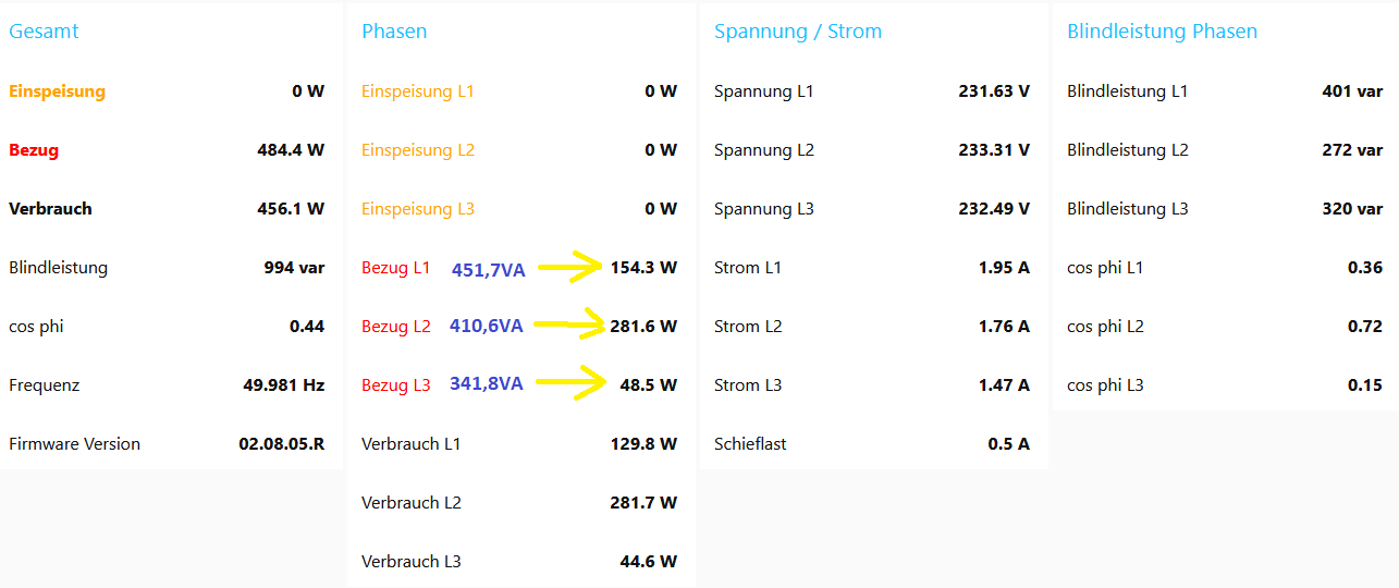 Wenn es nun noch zusätzliche phasenbezogene W-Werte gäbe, könnte das bei ev. vorh. Abweichungen zw. errechneten VxA und direkt gelesenen W-Werten zu Fragen führen.