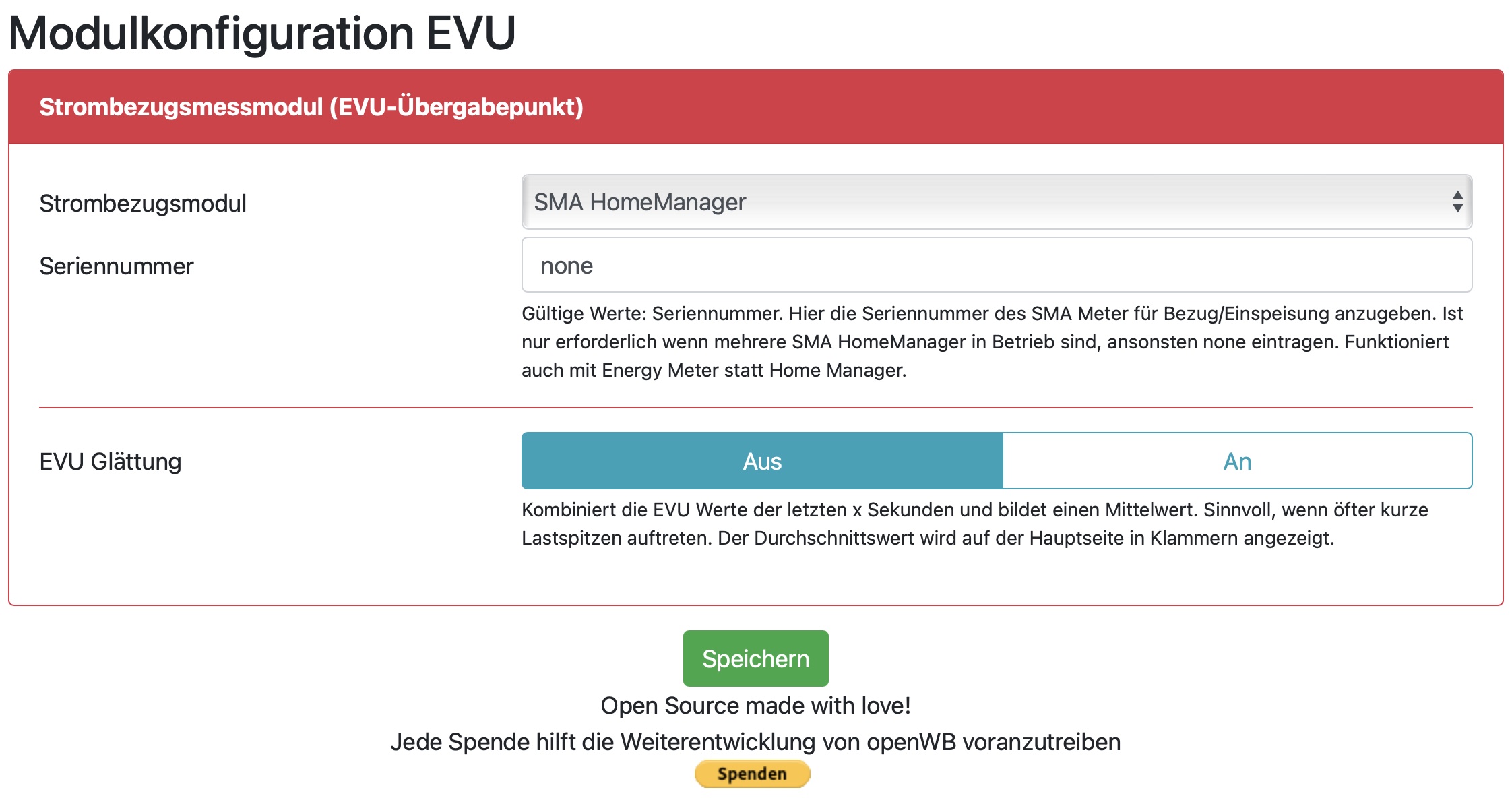 EVU ist der SMA HomeManager mit Seriennummer eingetragen. Glättung ist aus