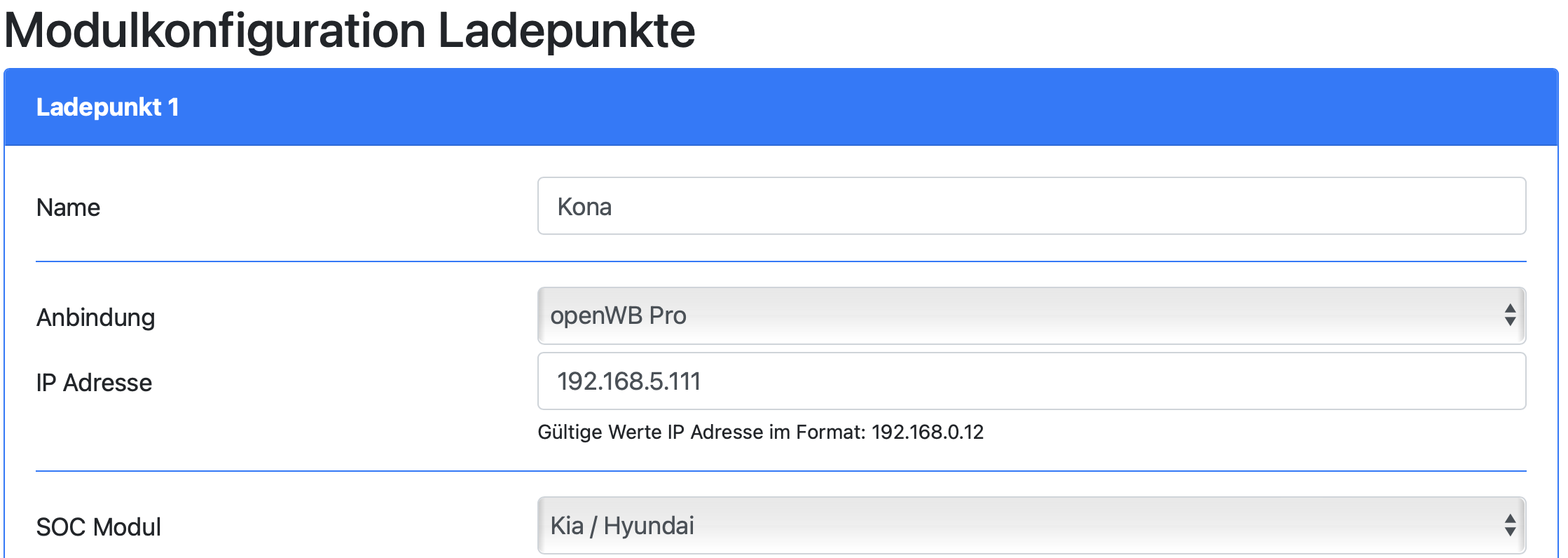 5. Wie ist denn eigentlich die Reihenfolge der Inbetriebnahme bei komplett neuer Umgebung?Wird die openWB Pro in Kombination mit einer openWB series2 (standalone, standard, standard+, custom, Duo oder Buchse) betrieben bitte nach erfolgreichem Ersttest ein Update der zugehörigen openWB auf wenigstens Version 1.9.244 Stable oder 1.9.250 Nightly durchführen und als Ladepunkt in der Modulkonfiguration openWB Pro auswählen und die IP Adresse angeben.