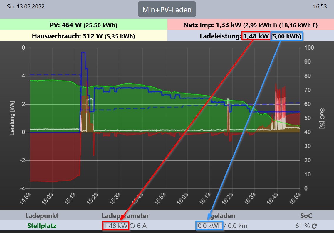 Wird das Auto geladen, wird oben die Ladeleistung und die geladenen kWh angezeigt.