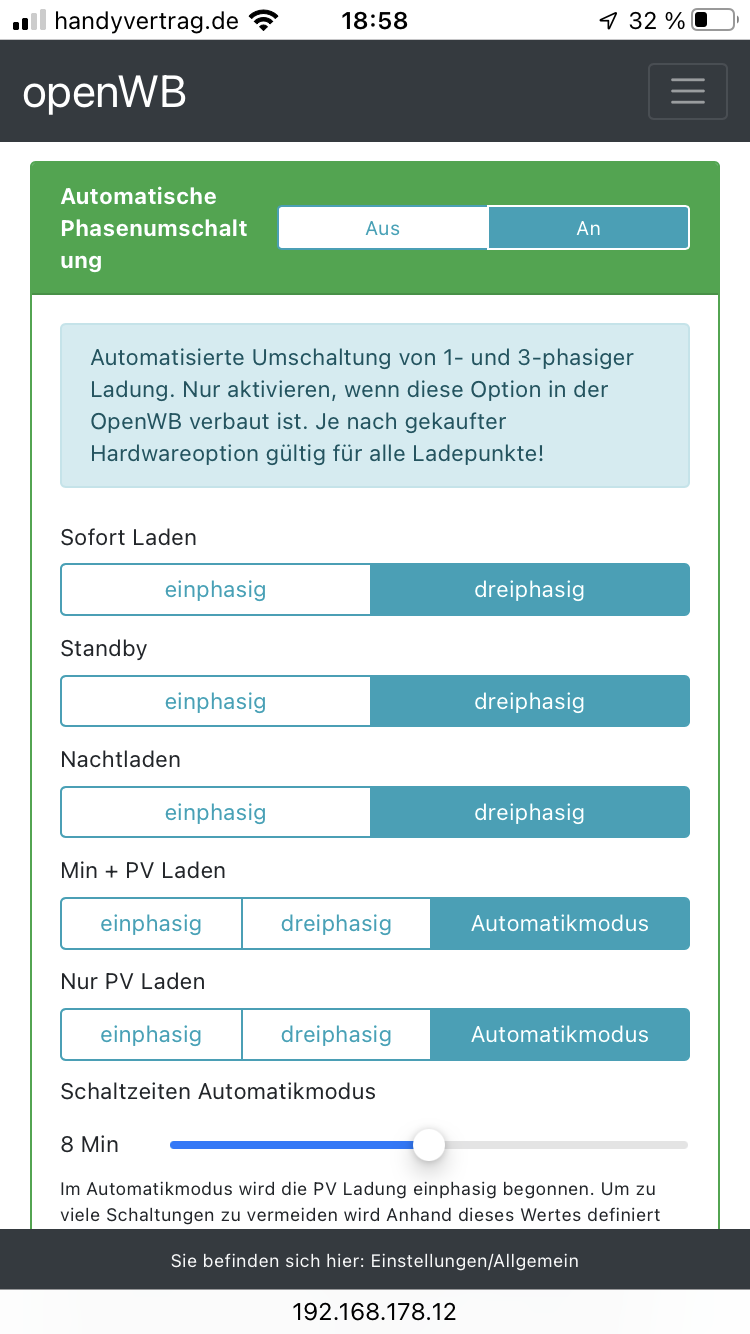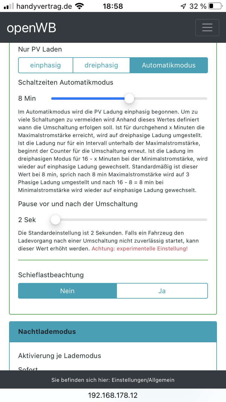 ich habe gerade bei dem schönen meine openWB genutzt. Ich habe per RFID den Ladepunkt freigeschaltet, das Auto angestöpselt und alles hat geklappt. Das Laden hat direkt 3phasig begonnen (warum?). Als ich die Kaffeemaschine anmachte, wurde das Laden nicht unterbrochen, da ja erst eine gewisse Zeit vergangen sein muss. Allerdings hat dann das Laden einfach so gestoppt. Auf einphasig wird nicht gewechselt, obwohl noch genug Strom erzeugt wird. Ich habe auch den Ladevorgang erneut gestartet, habe zwischen Stop und PV hin- und heugewechselt, habe den Ladestecker ab- und wieder angesteckt und erneut per RFID die Buchse freigegeben. Es tut sich nichts. Was ist zu tun?